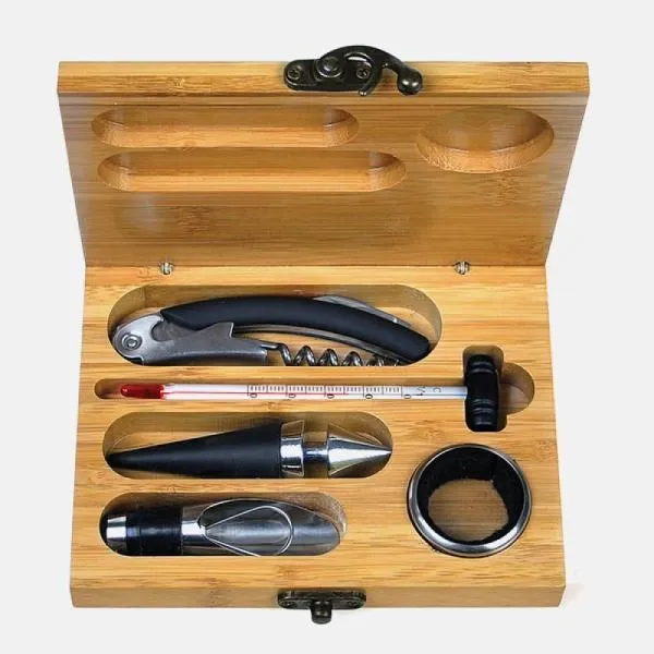 Composto por cinco acessórios para vinho em metal e inox, sendo um anel corta-gotas, um funil direcionador com tampa e tampão, ambos com detalhes emborrachados para melhor fixação na garrafa, um termômetro e um abridor saca-rolhas modelo sommelier de alavanca simples com três funções acomodados em um estojo em bambu.