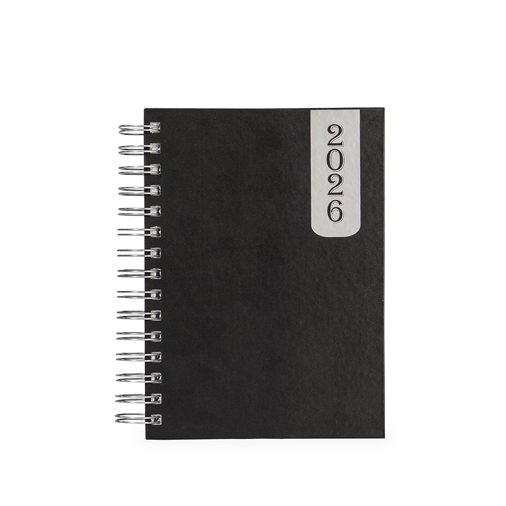 Agenda diária 2026 com capa dura em prime, bolso plástico interno e encadernação Wire-O. Contém páginas dedicadas dados pessoais, calendários de 2025 até 2027, lista de contatos, planejamento diário e mapas.