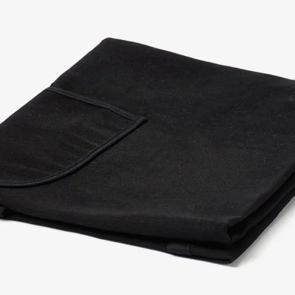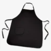 Avental em Brim preto. Conta com um bolso frontal, tiras para amarrar na cintura e pescoço, com regulagem de altura.