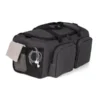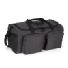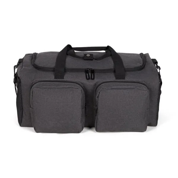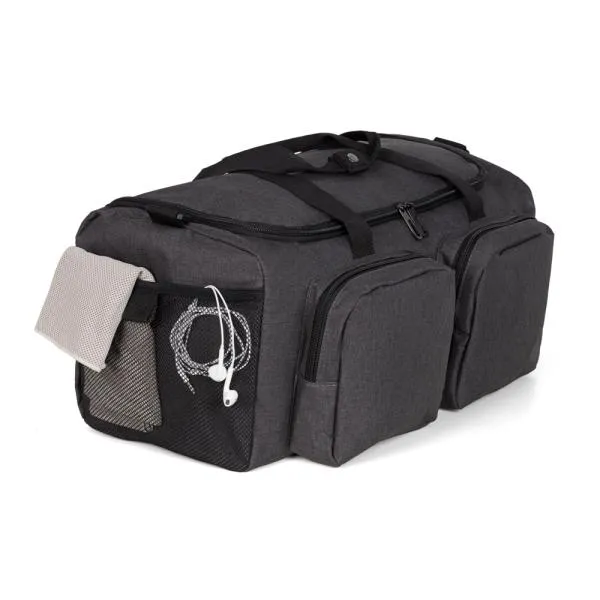 Bolsa esportiva cinza confeccionada em RPET (tecido reciclado).