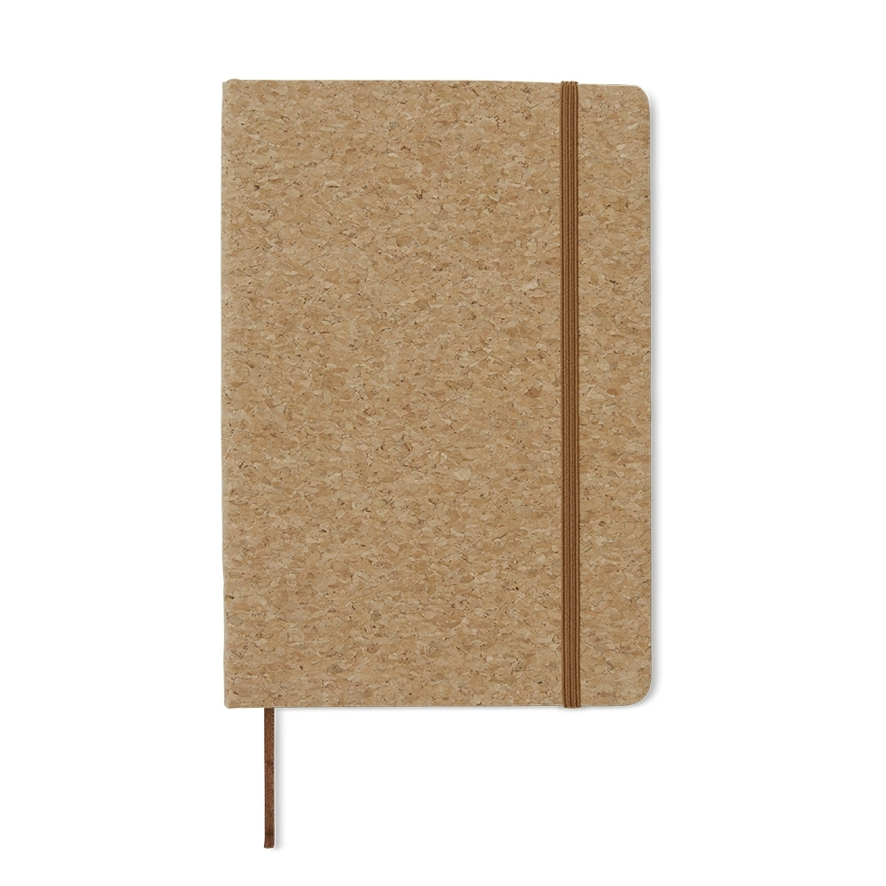 Caderneta de cortiça, contém aproximadamente 80 folhas amarelas com pauta, marcador de página em cetim e elástico para lacre.