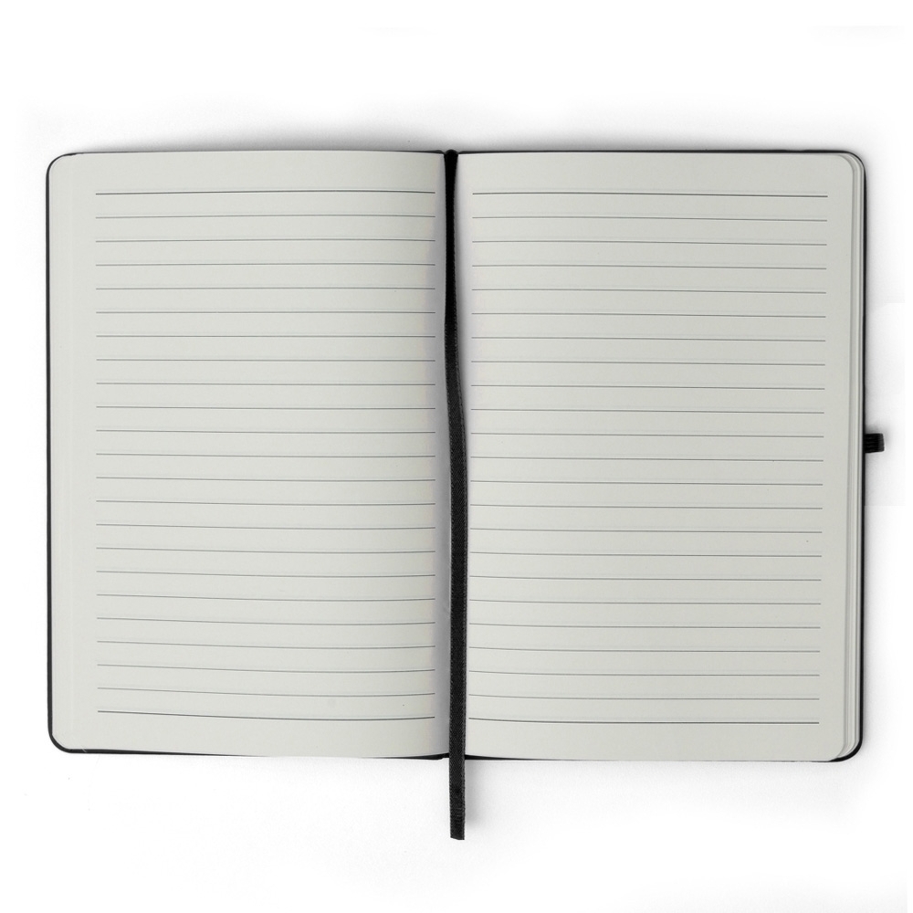Caderneta emborrachada com porta caneta elástico em nylon, marcador de página em cetim e fita elástica de nylon para fechar. Contém aproximadamente 80 folhas pardas pautadas.