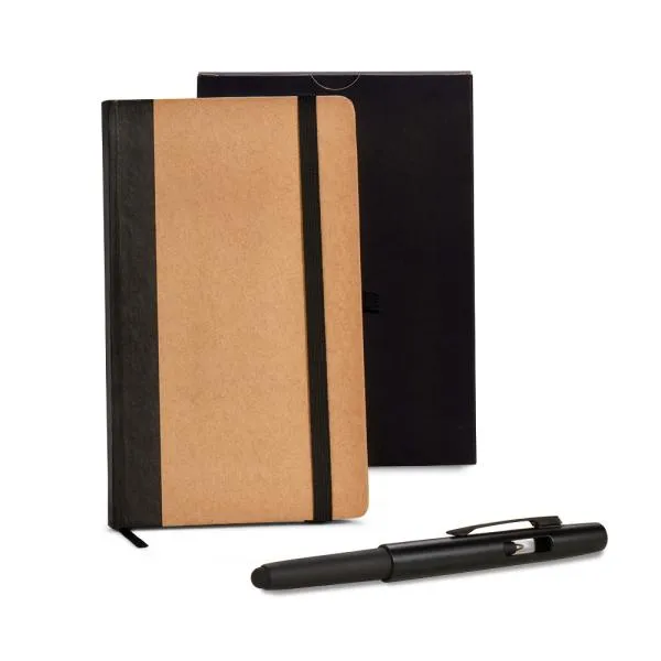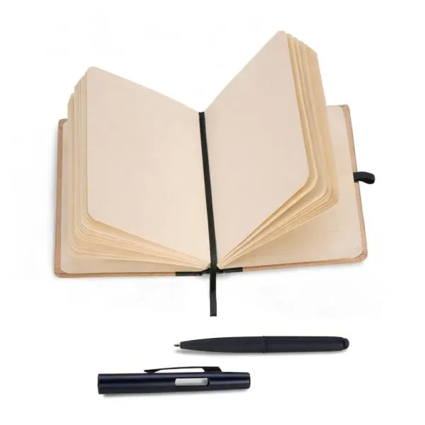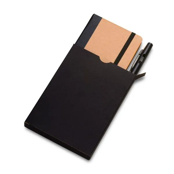 Caderno para anotações com capa dura nas cores Preto/Bege e caneta esferográfica em ABS preta.