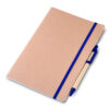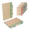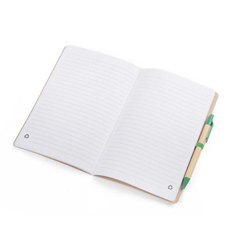 Kit escritório, contendo: 1 Caderno de anotações 21,5x14cm, capa em papel kraft com elástico, suporte para caneta e miolo pautado com 30 folhas. 1 Caneta corpo em papel reciclado com detalhe em plástico.