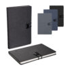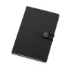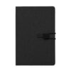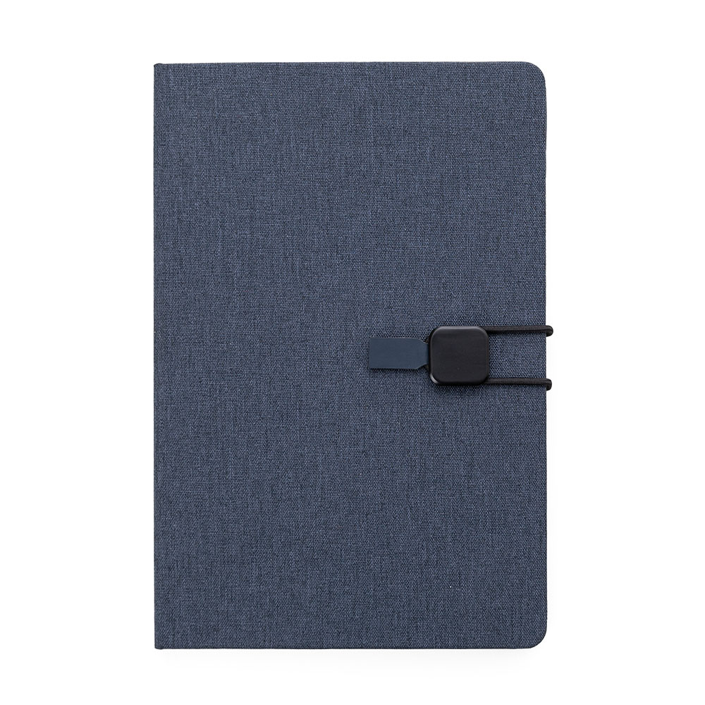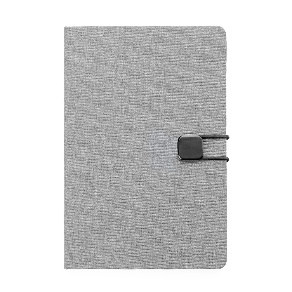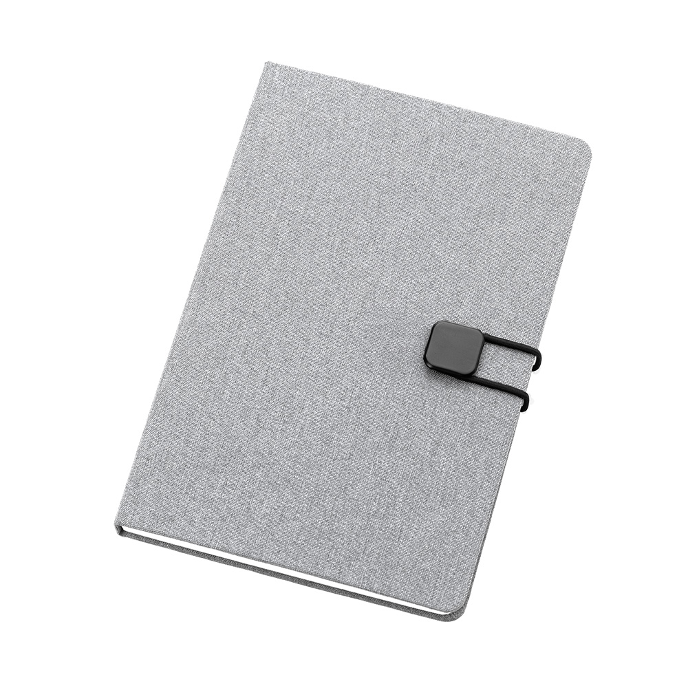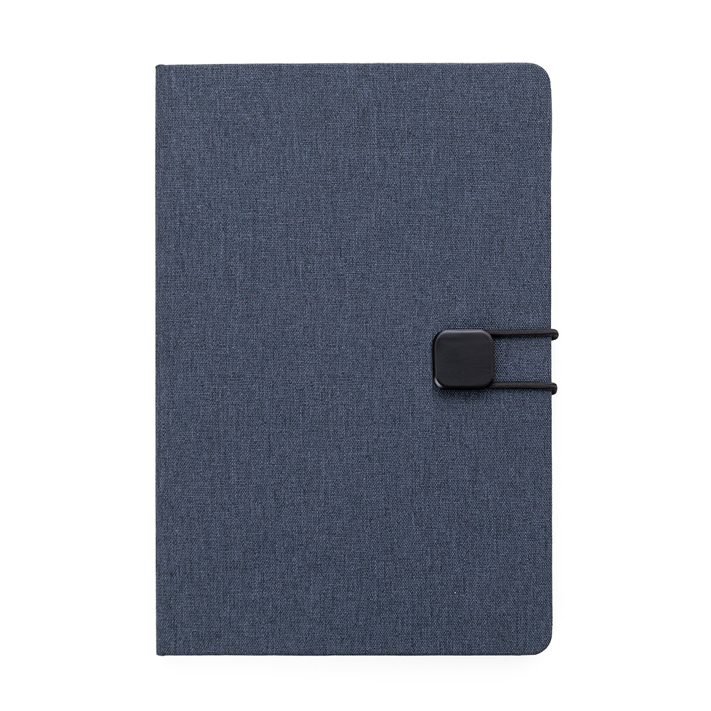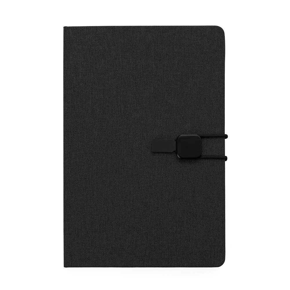Caderno de anotações com elástico, capa dura em tecido poliéster com fechamento na capa em metal, miolo 80 folhas pautadas na cor bege.