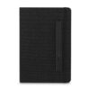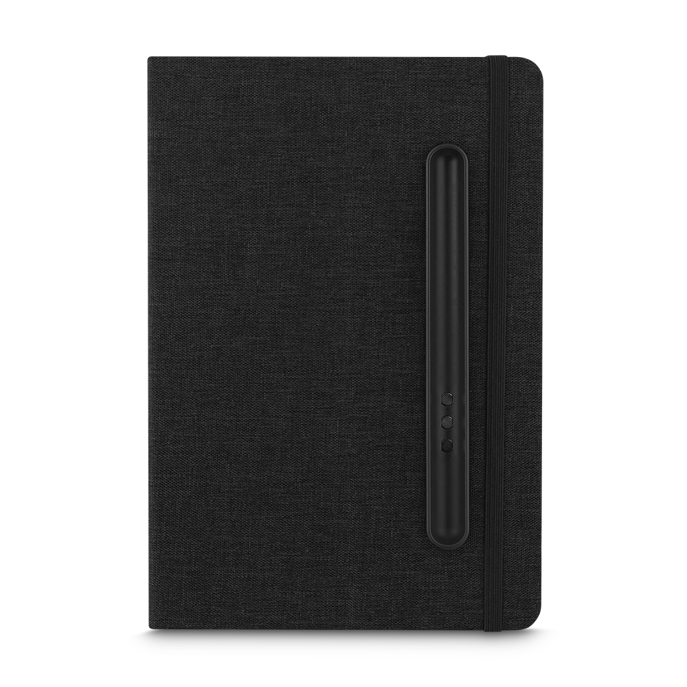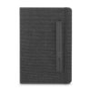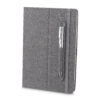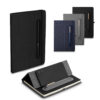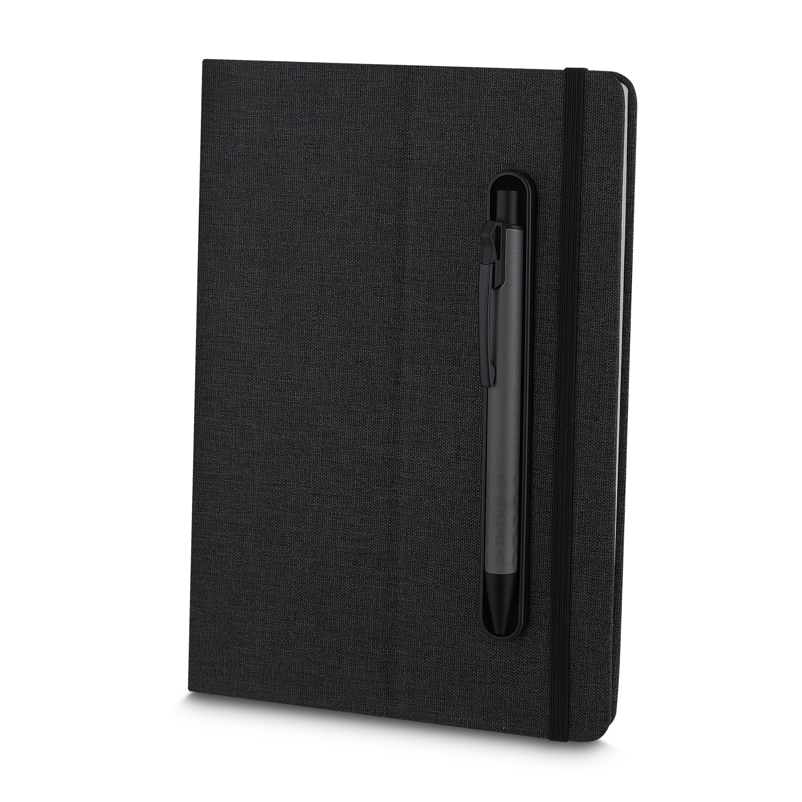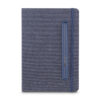 Caderno produzido com capa em tecido RPET e suporte para caneta na capa, capa dobrável para suporte de smartphone, miolo com 80 folhas pautadas. * Não acompanha caneta, imagem meramente ilustrativa.