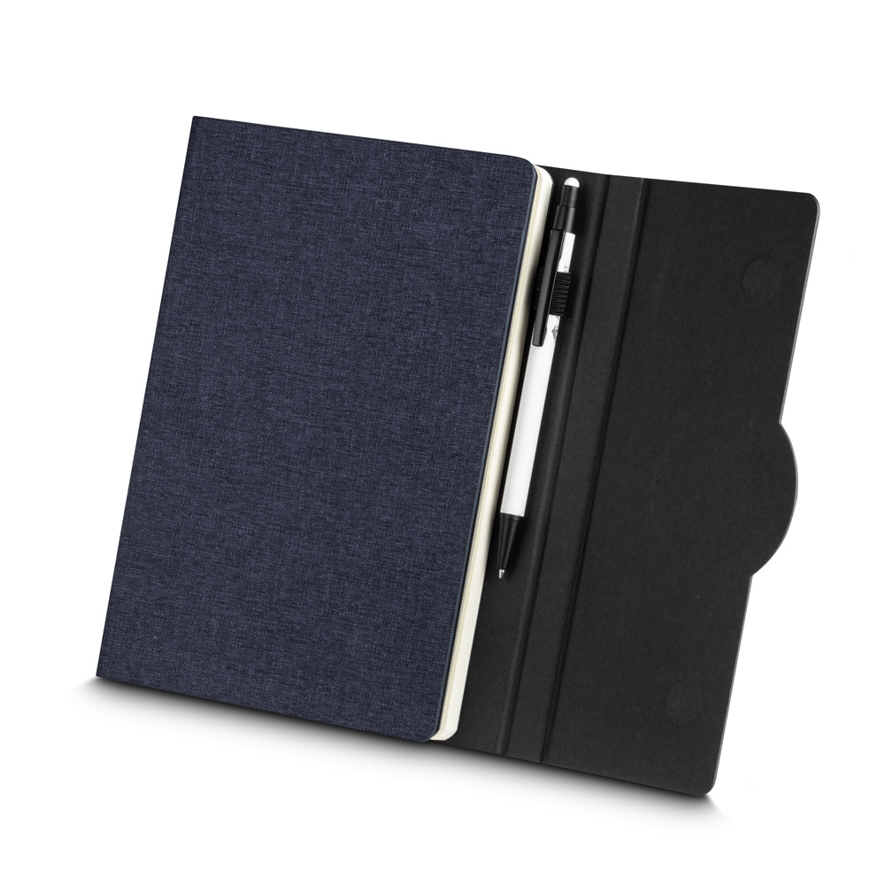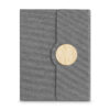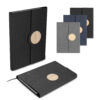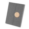 Caderno de anotações, capa em tecido RPET e detalhe em bambú com suporte para caneta na parte interna, miolo com 80 folhas pautadas.