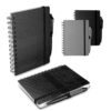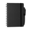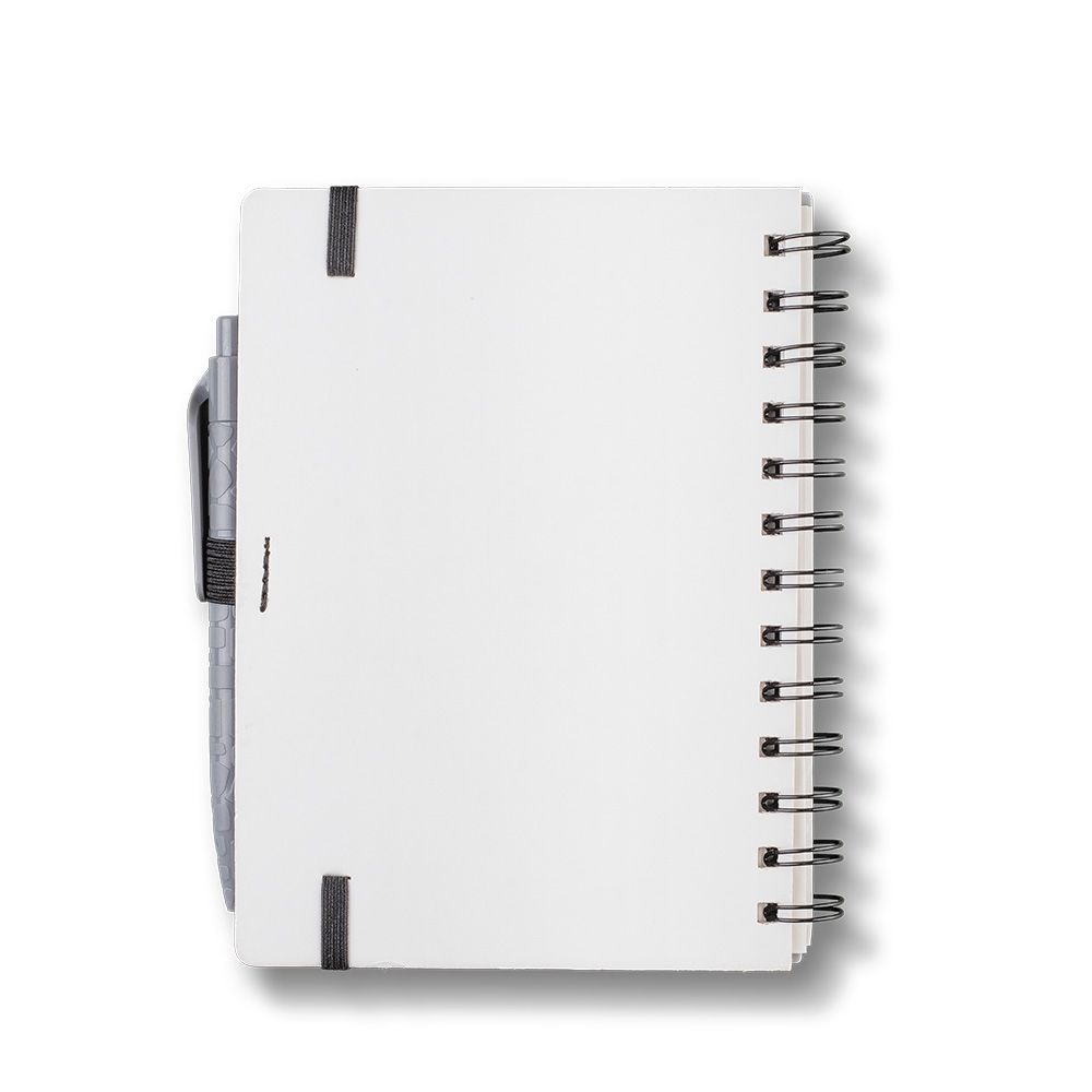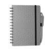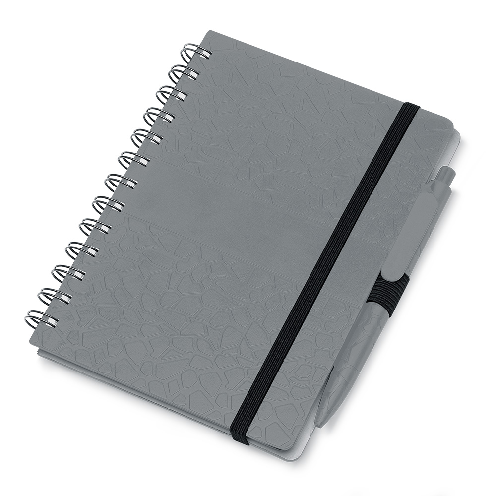 Caderno de anotações em ABS reciclável com aspiral e suporte para caneta. Com capa dura e textura que imita ”pedra”, suas folhas são impermeáveis e resistentes a rasgos, miolo com 70 folhas pautadas na cor branca. Acompanha caneta plástica com textura imitando pedra.