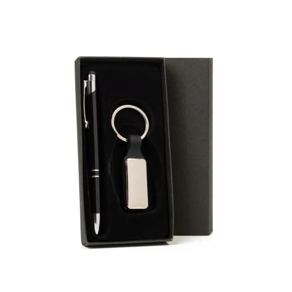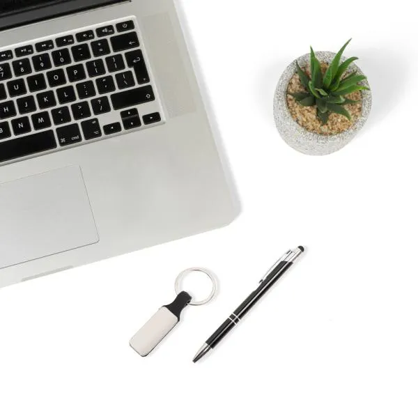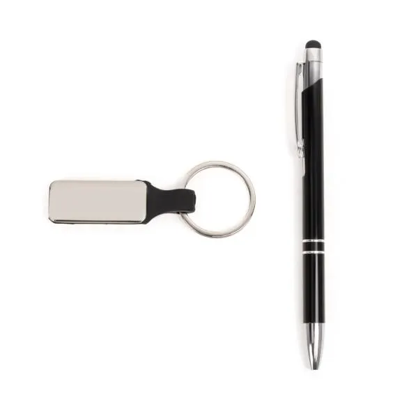 Composto por caneta esferográfica em alumínio preta com acabamento cromado, clipe em Metal e ponteira touch em silicone. Conta também com chaveiro confeccionado em Metal em seus dois lados e borracha central.