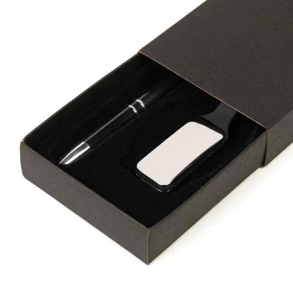 Gravação: Uma gravação a Laser na caneta e chaveiro; uma gravação em Silk/Digital na caixa.