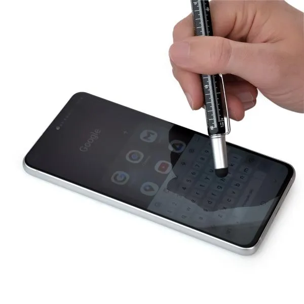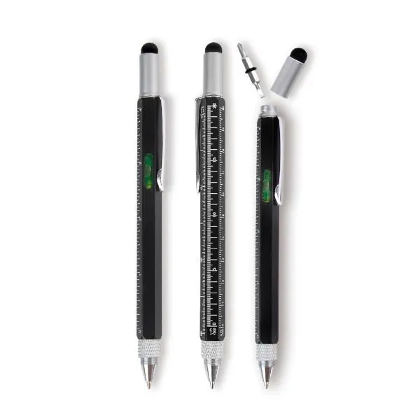 6×1 = esferográfica, nível, régua com 4 escalas (centimetro 1/100m, 1/200m, 1/300m e polegadas), ponta touch, fenda e philips.