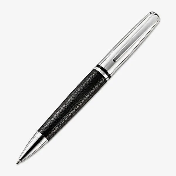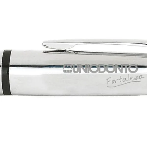 Caneta confeccionada em metal cromado brilhante com corpo revestido em material sintético preto texturizado. Carga esferográfica azul, acionada com um giro no corpo da caneta.