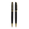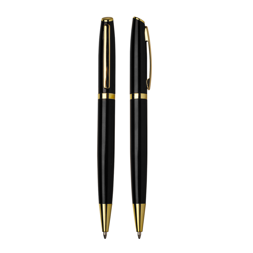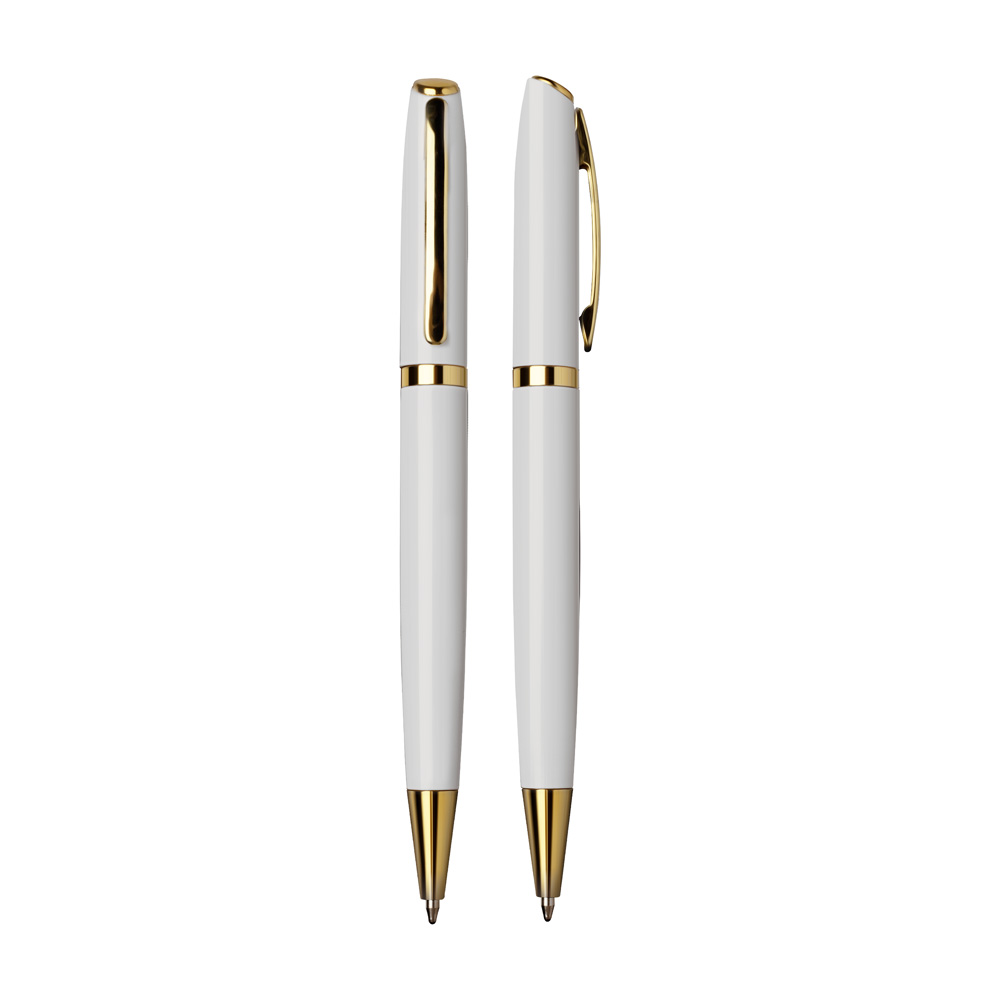 Caneta esferográfica de alumínio escrita em azul.
