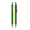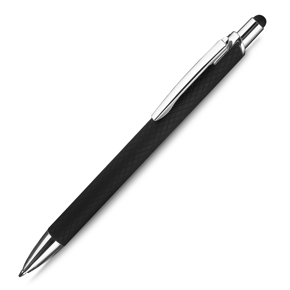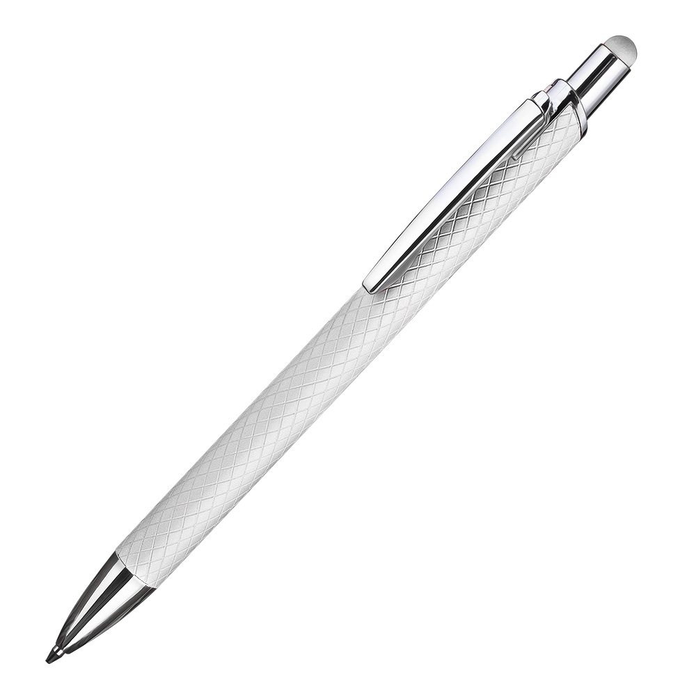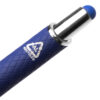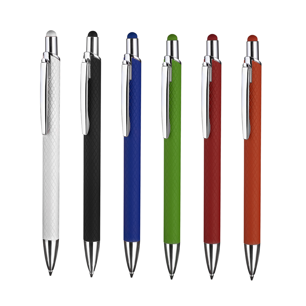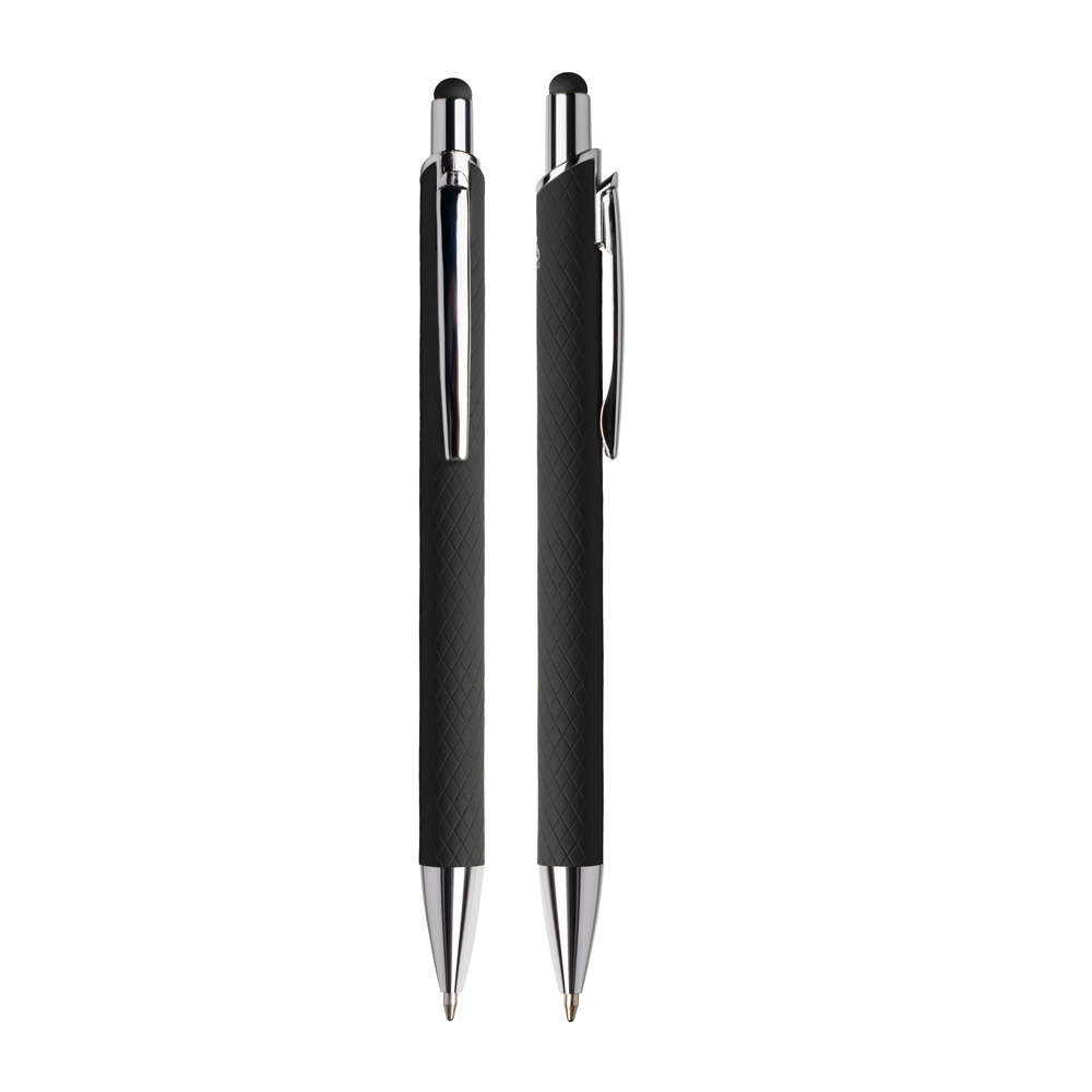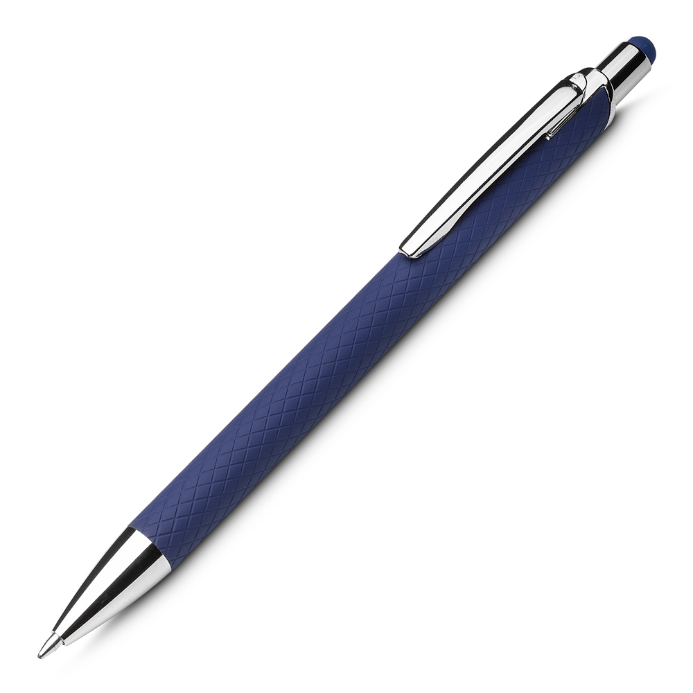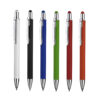Caneta esferográfica em alumínio reciclavel com escrita em azul. Refil tipo parker e ponta touch emborrachada. *apresenta símbolo de reciclável na parte traseira da caneta.
