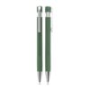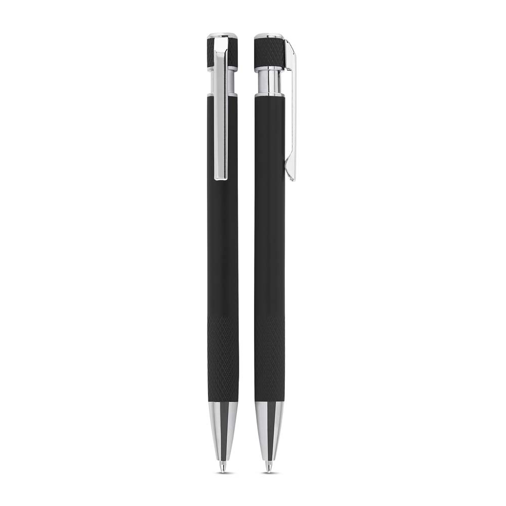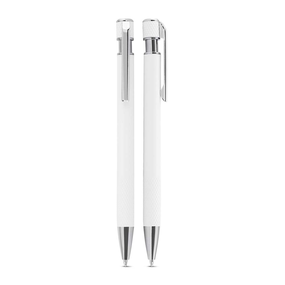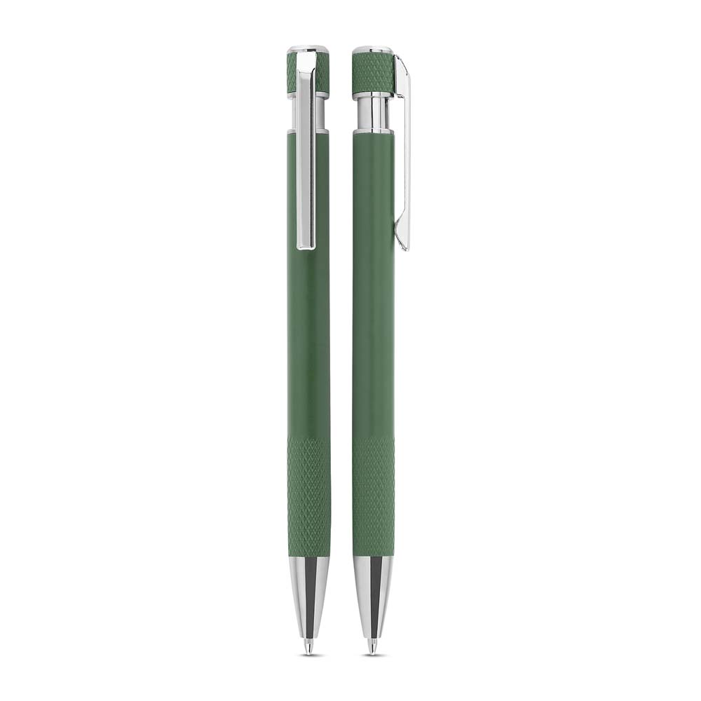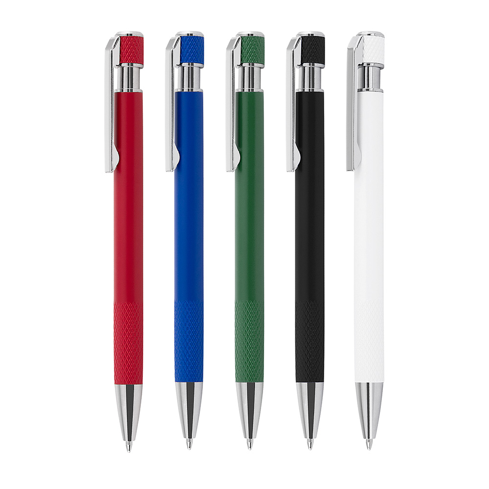 Caneta esferográfica com corpo em alumínio reciclado, acionador e clipe cromado, escrita em tinta azul. Refil substituível tipo Parker.