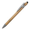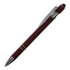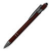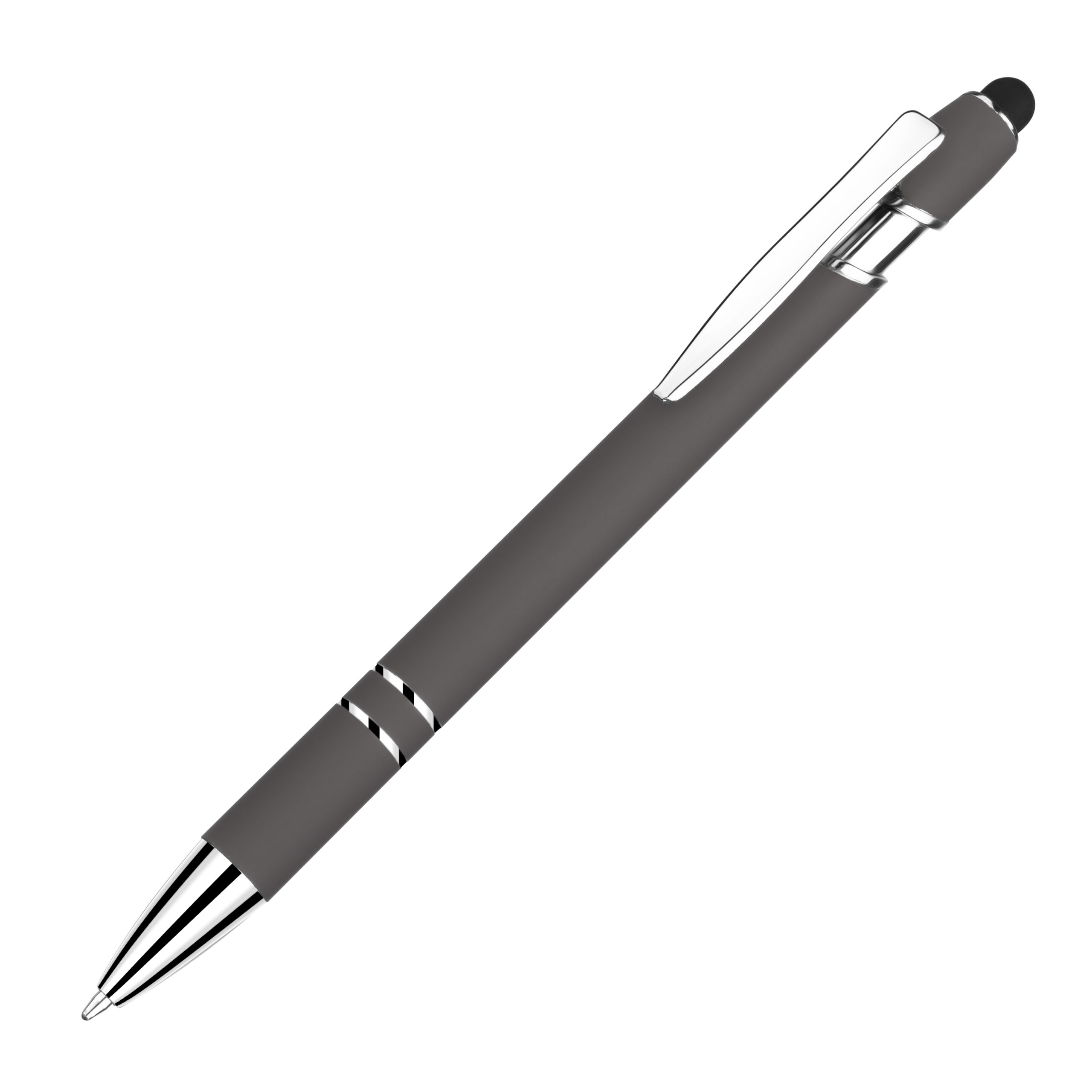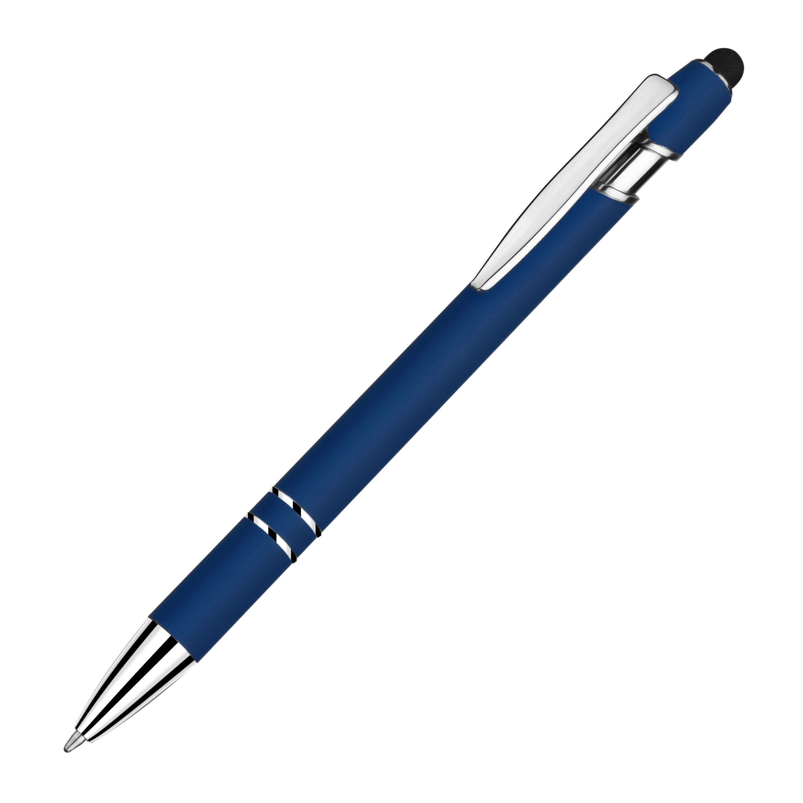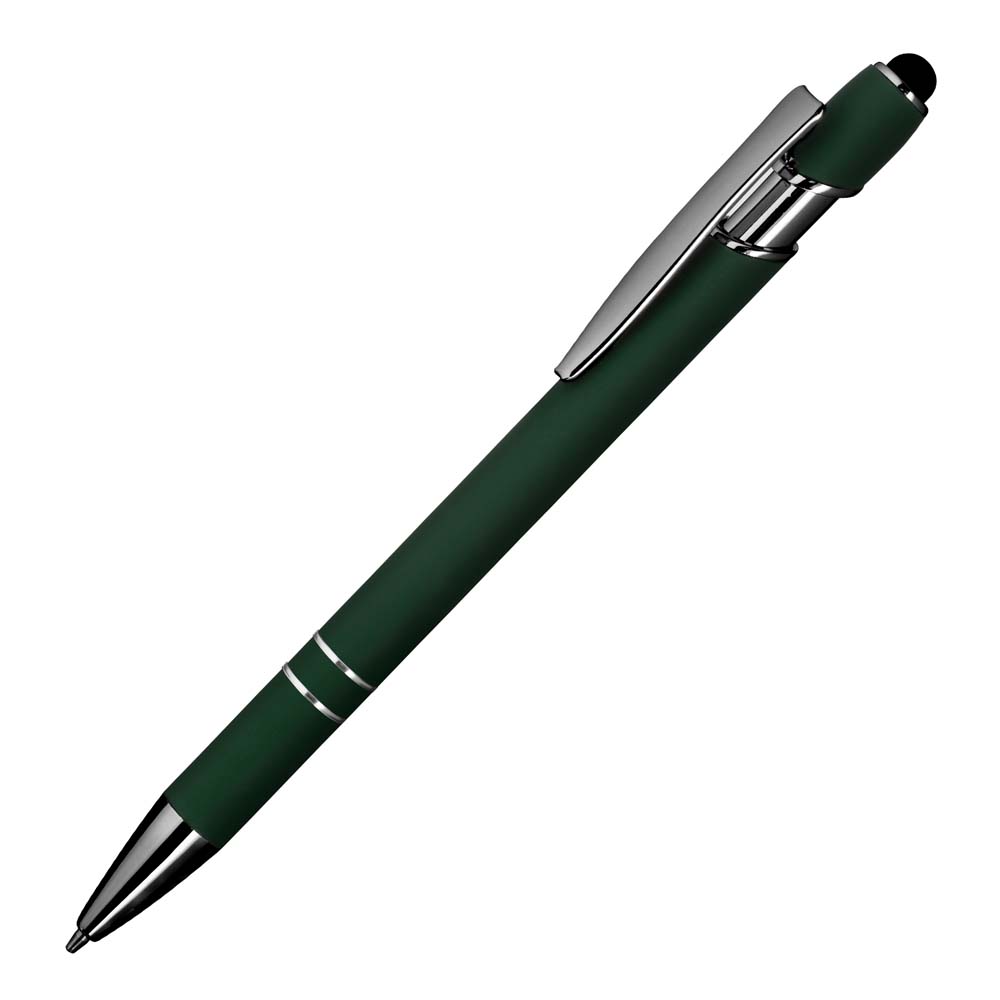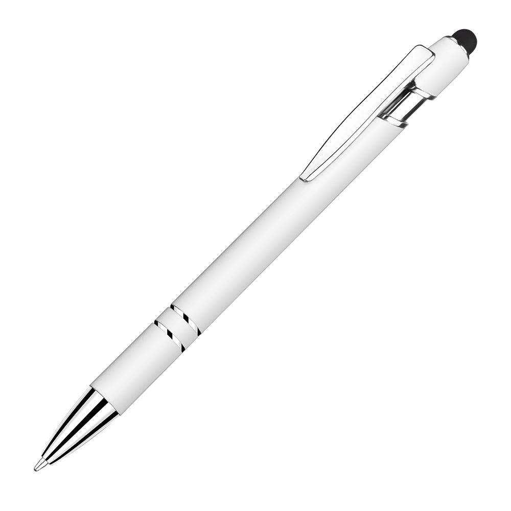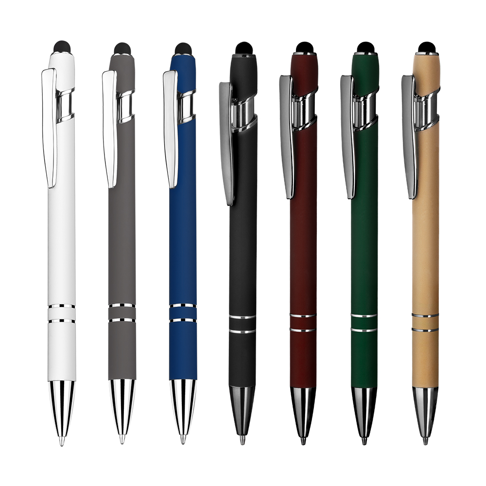 Caneta esferográfica em metal escrita em azul com corpo emborrachado. Refil tipo parker com ponta touch emborrachada. Detalhe metálico brilhoso nas cores: Azul, cinza e branco. Detalhe metálico cromado nas cores: Vermelha, verde, dourado, e preto