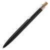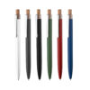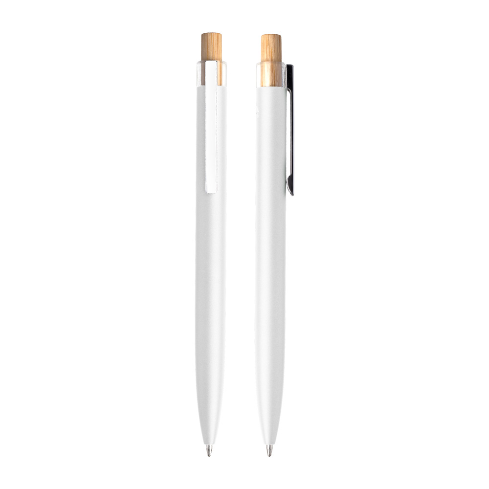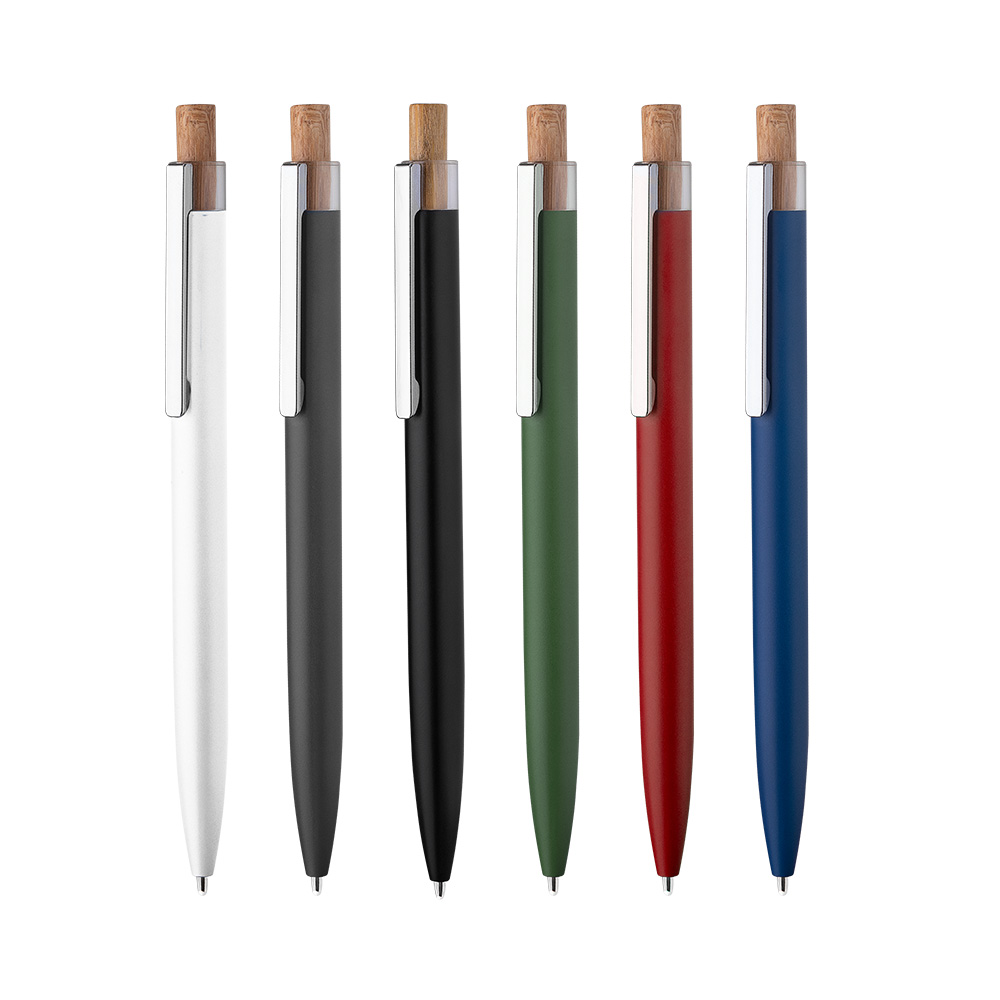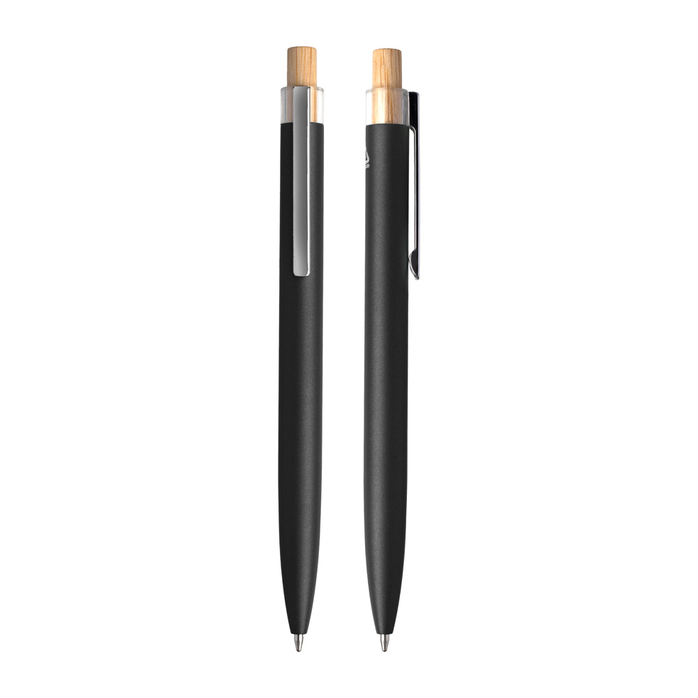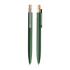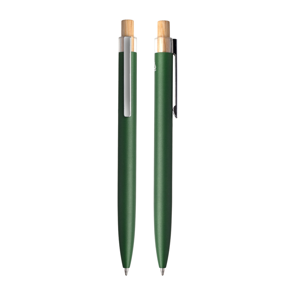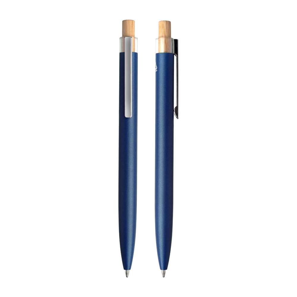 Caneta esferográfica em alumínio reciclável com escrita em azul. Refil parker e acionador em bambu. *apresenta símbolo de reciclável na parte traseira da caneta.
