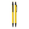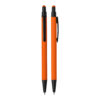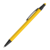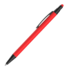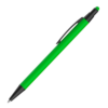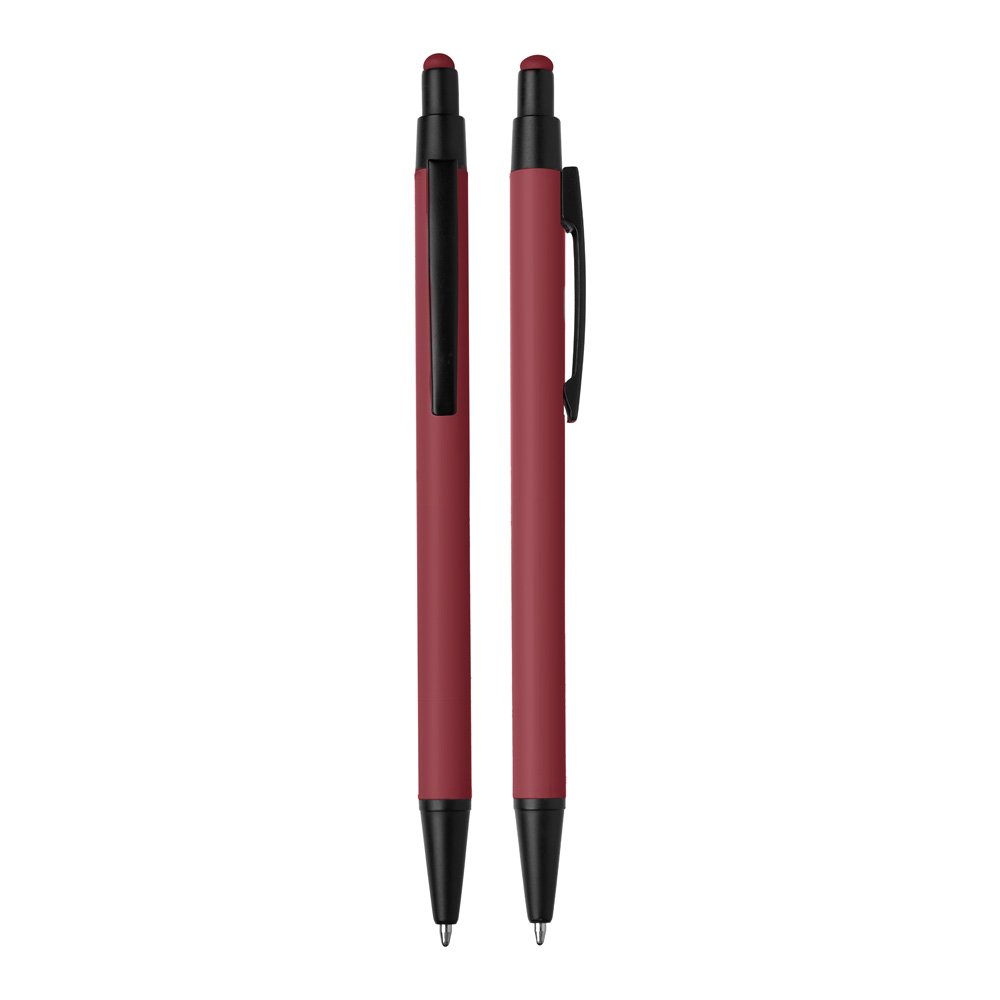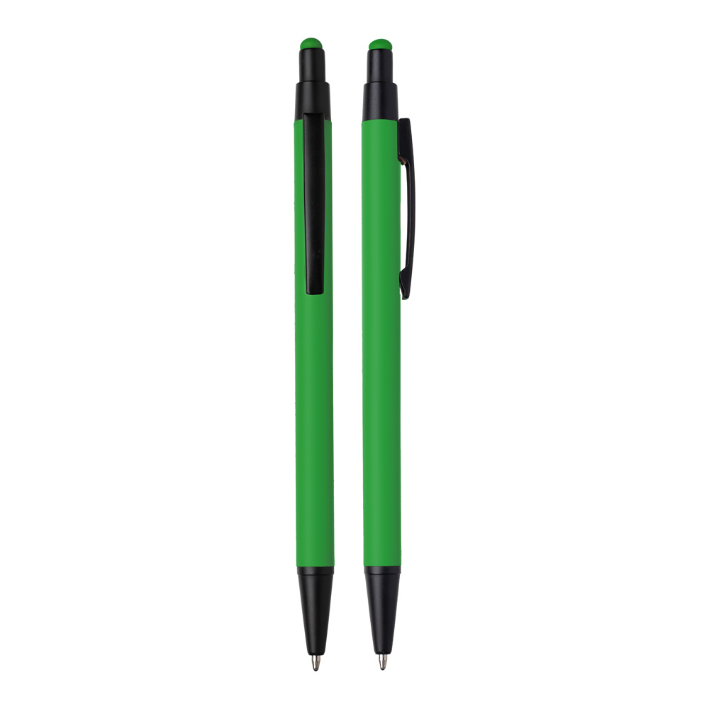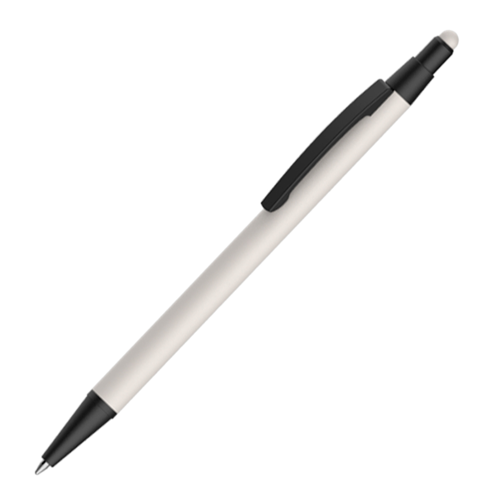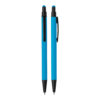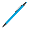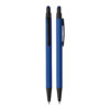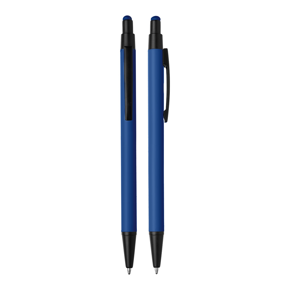 Caneta esferográfica em metal Emborrachada com ponta touch escrita em azul.