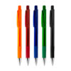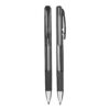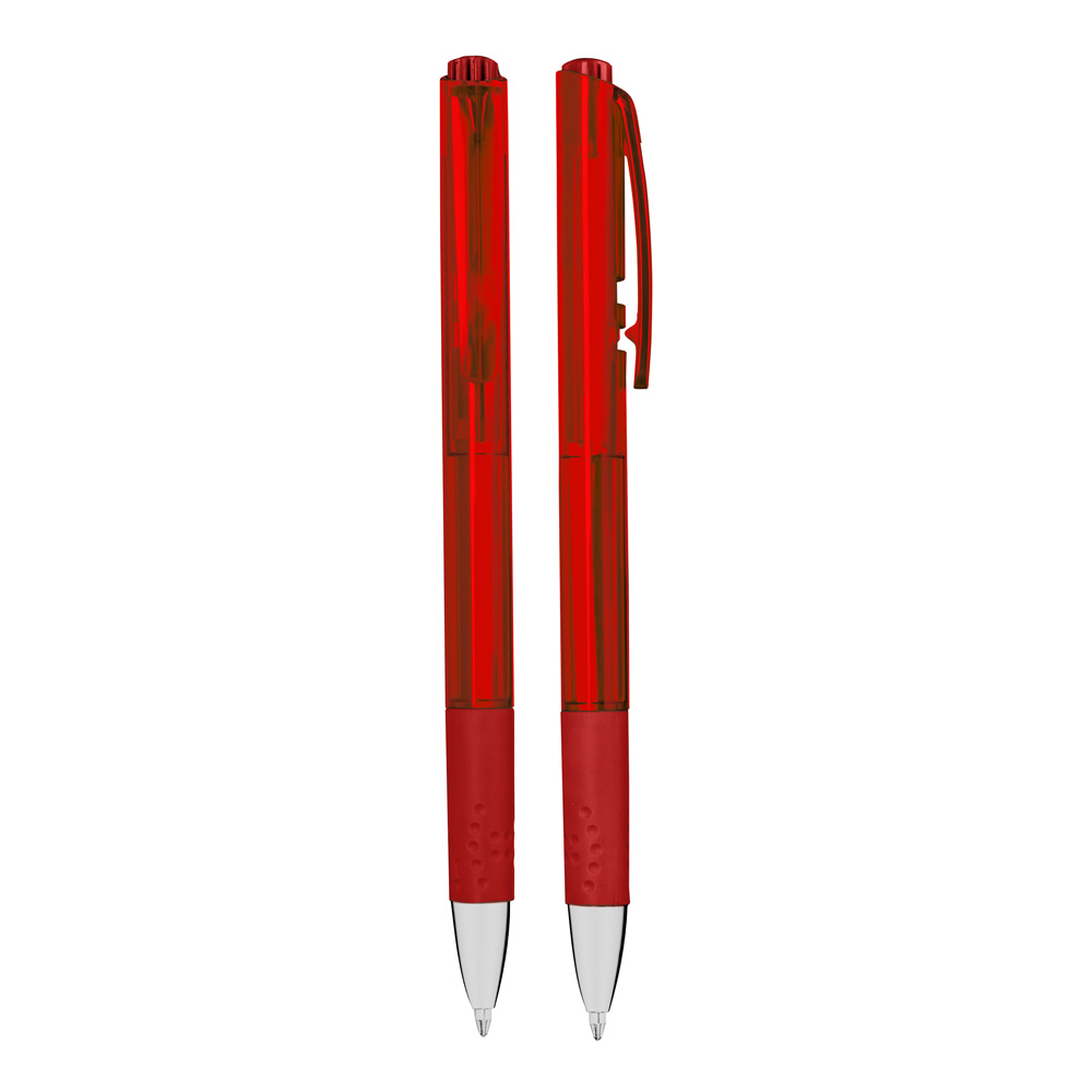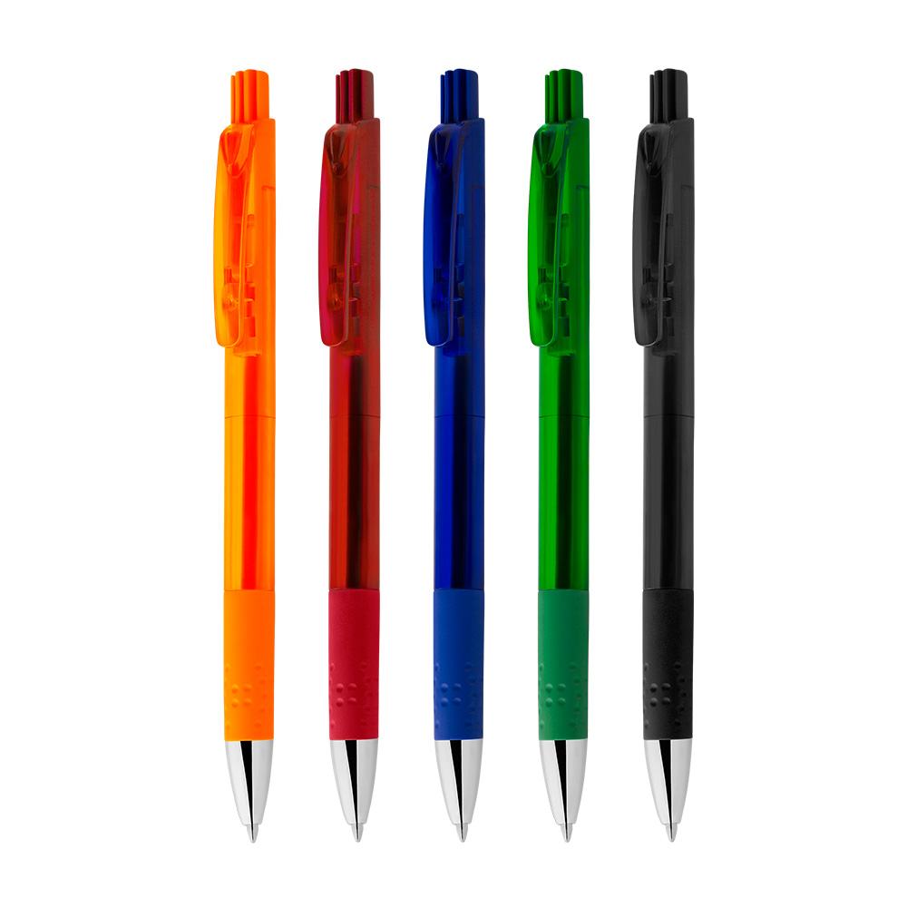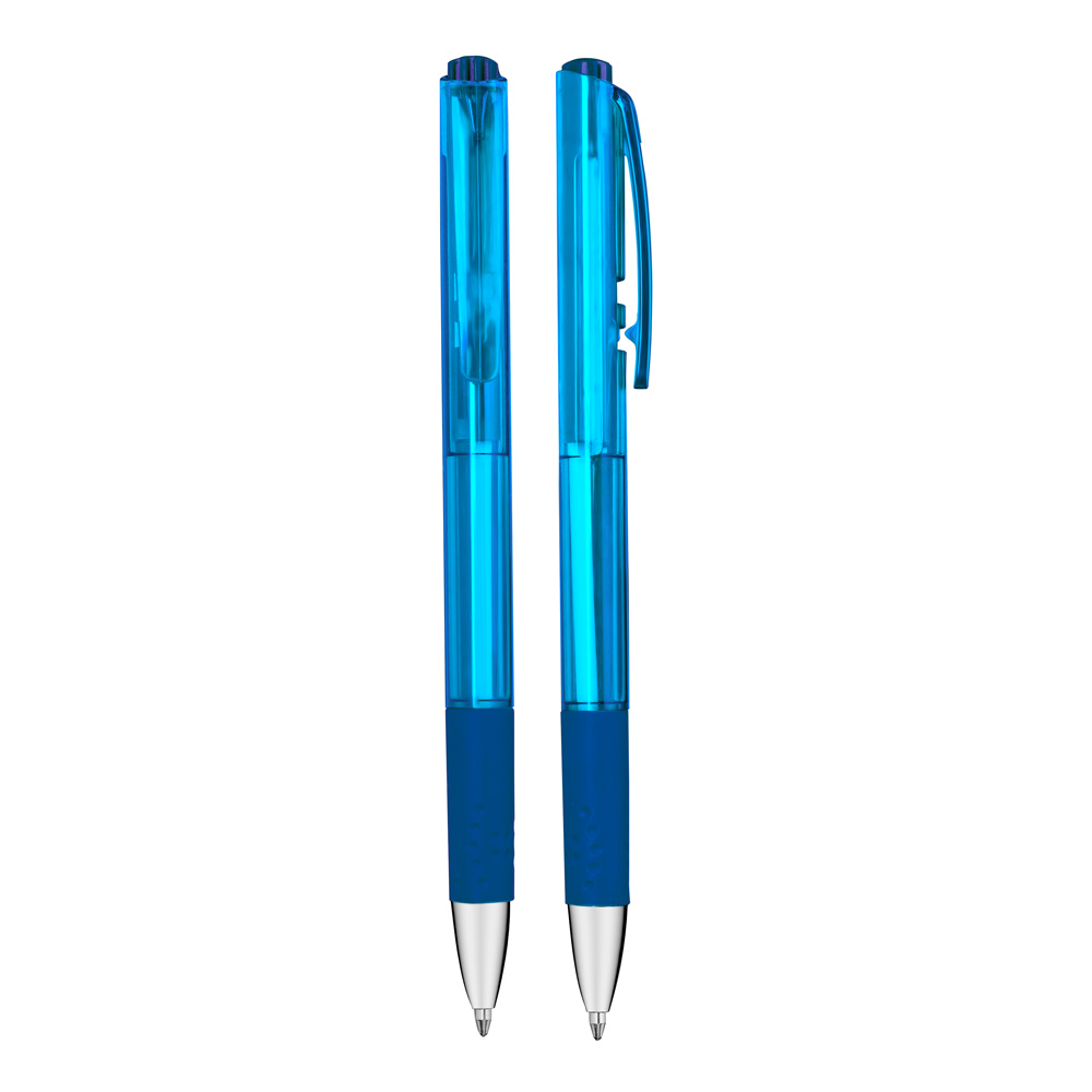 Caneta plástica com grip esferográfica retrátil escrita em azul.