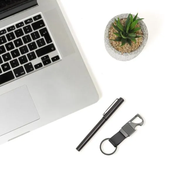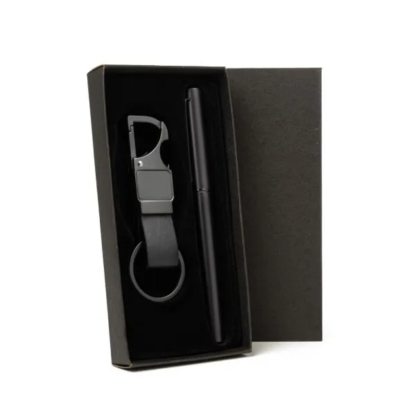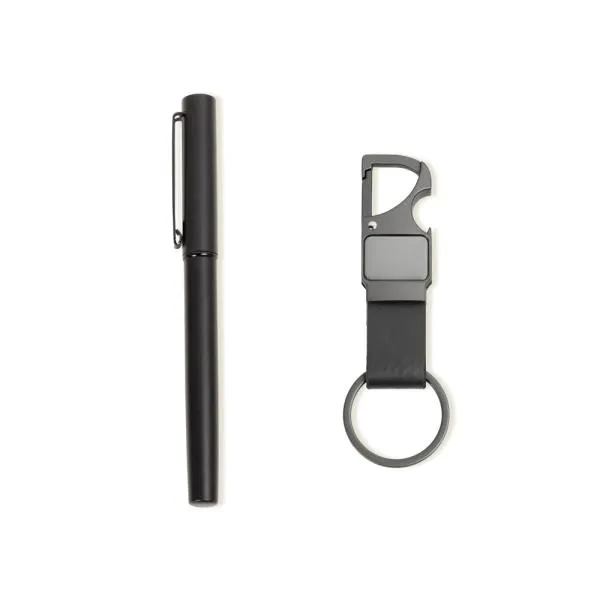 Composto por caneta roller em alumínio com tampa preta, clipe e acabamento fosco com carga roller azul. Conta também com chaveiro em metal e partes em PU.