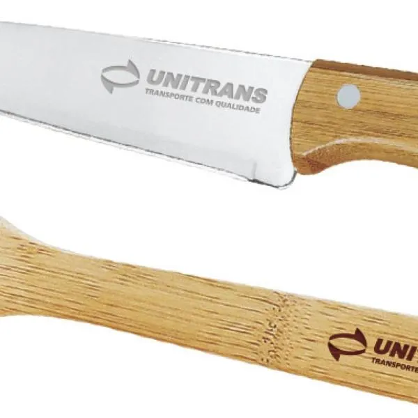 Conjunto de Faca em Bambu/Aço Inox; Acompanha faca 7” em Bambu/Inox e colher em Bambu 30cm.
