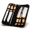 Conjunto composto por faca 8”, cutelo 6” e garfo trinchante em Madeixa/Inox; chaira 8”, faca Santoku 7” e faca 7” para pão em Bambu/Inox. Estão organizados em fita elástica preta no interior de um estojo.