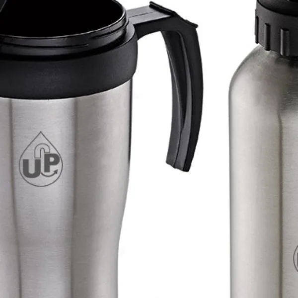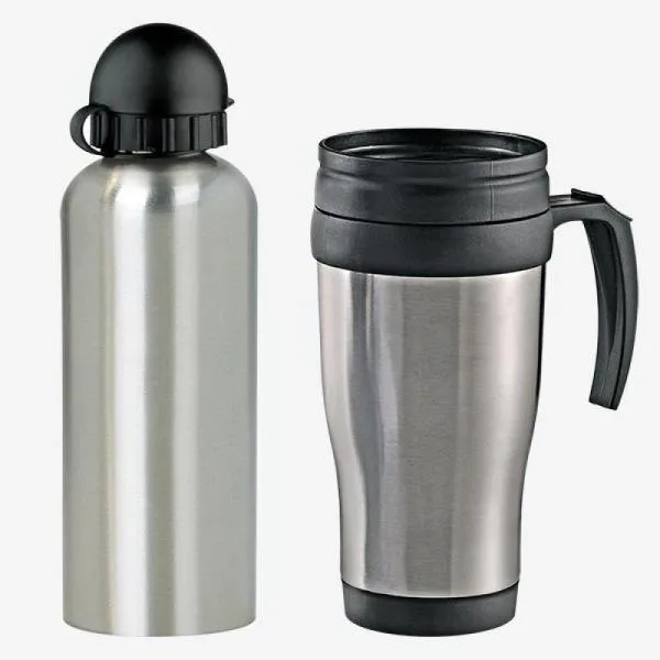 Conjunto composto por um squeeze em aço inox/polipropileno de 600ml e uma caneca em polipropileno/aço inox de 410ml, perfeitamente acomodados em uma caixa kraft com tampa.