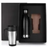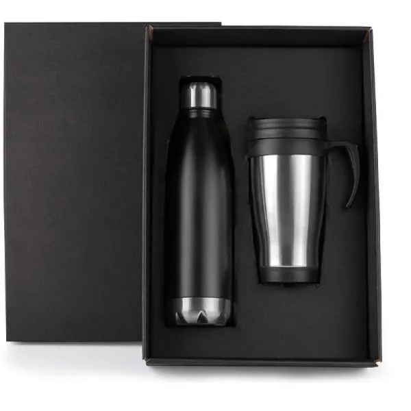 Kit composto por garrafa em aço Inox preta com capacidade de 750ml e tampa rosqueável, conta também com caneca em polipropileno preto revestida em aço inox escovado.