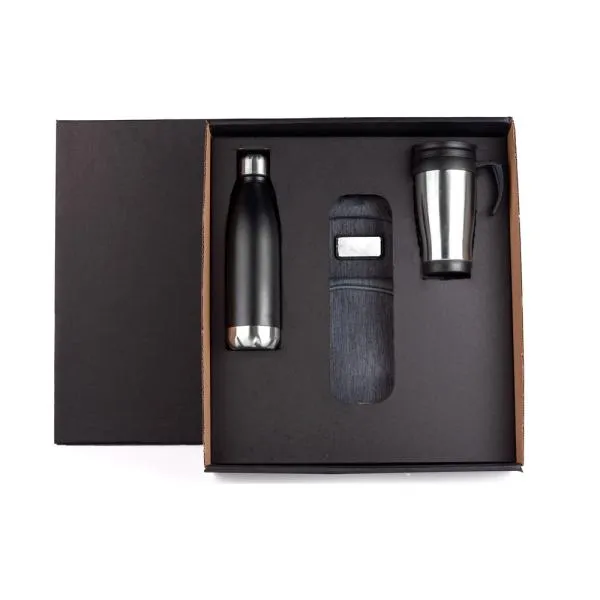 Kit conta com mochila cinza em poliéster 300D Melange cinza; garrafa em aço Inox preta com tampa rosqueável e caneca em polipropileno preto revestida em aço inox escovado.