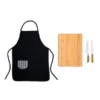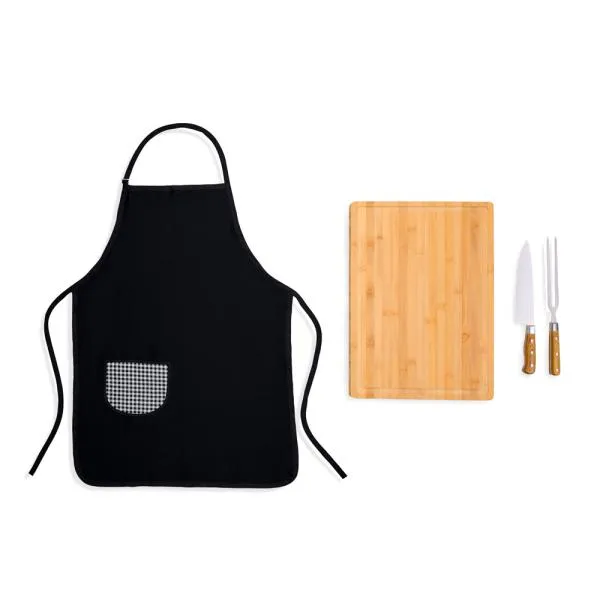 Conjunto para Churrasco. Composto por tábua em Bambu para Churrasco; faca e garfo premium em Madeira / Inox. Conta também com avental Gourmet em Brim preto.