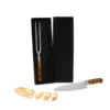Gravação: Uma gravação a Laser na tábua e na lâmina da faca; uma gravação em Silk/Digital na embalagem do conjunto faca/garfo, tampa da caixa e avental.