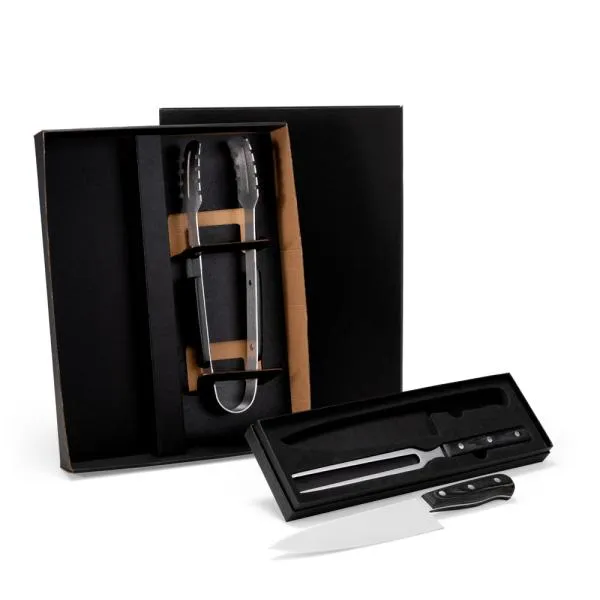 Gravação: Uma gravação a Laser na lâmina da faca e no cabo do pegador; uma gravação em Silk/Digital na embalagem do conjunto faca/garfo e tampa da caixa.