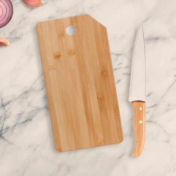 Conjunto composto por uma tábua retangular em tripla camada invertida de Bambu com um furo e uma faca 7” com gravação dos cortes do boi, cabo em Bambu e lâmina em Aço Inox com rebites resistentes.