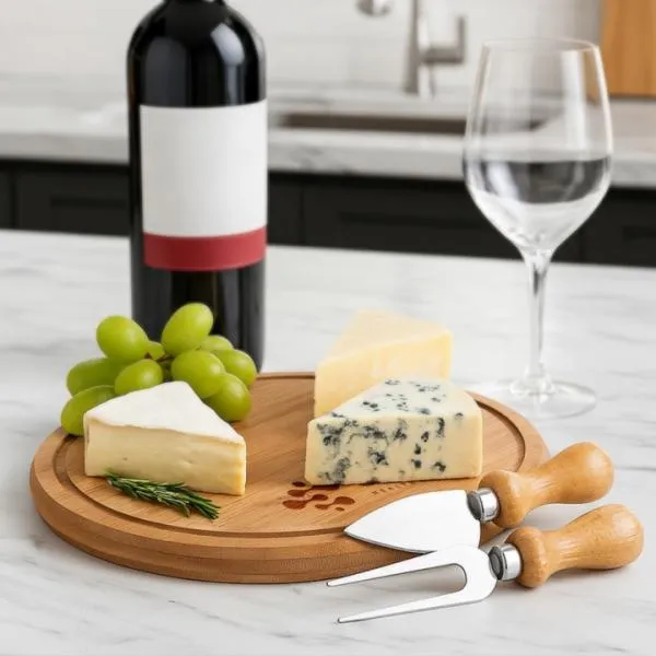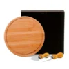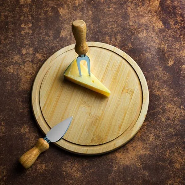 Conjunto para Queijo em Bambu/Madeira/Inox. Conta com tábua em Bambu; faca com ponta e garfo para Queijo em Madeira/Inox.