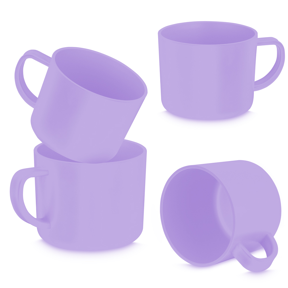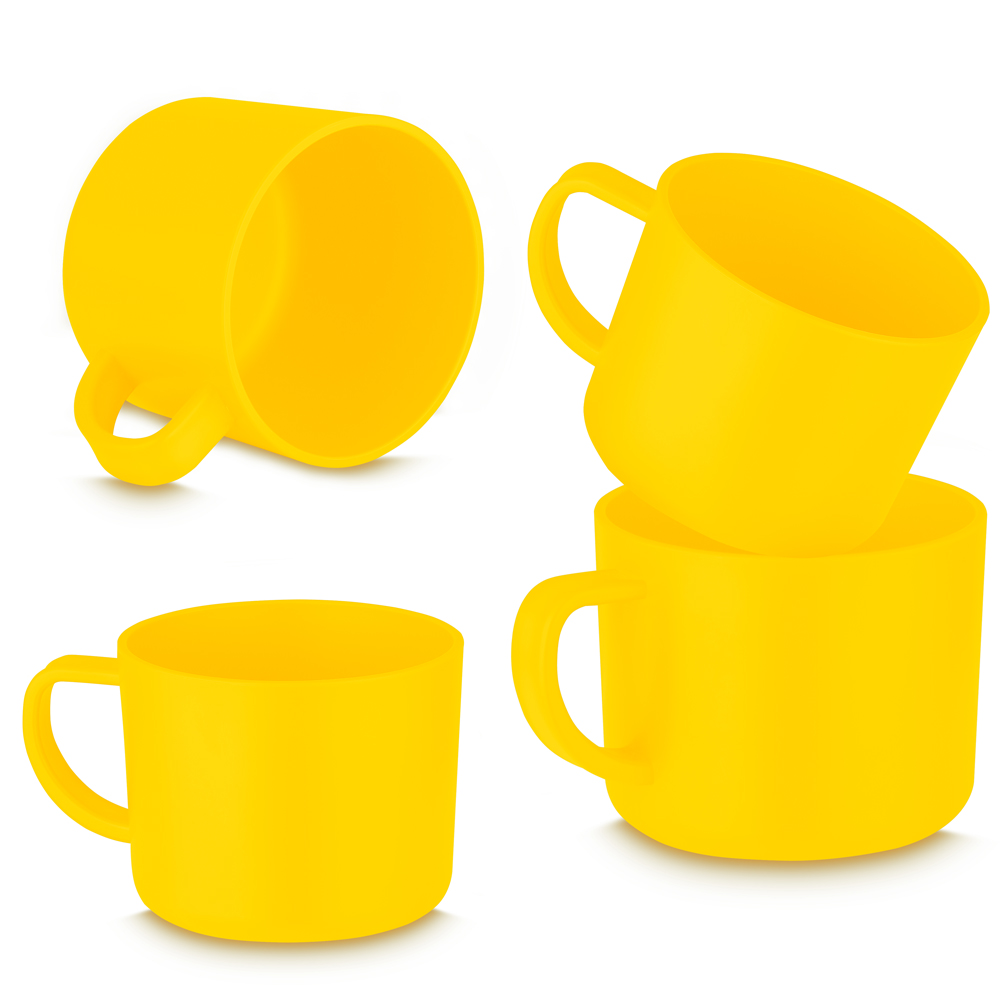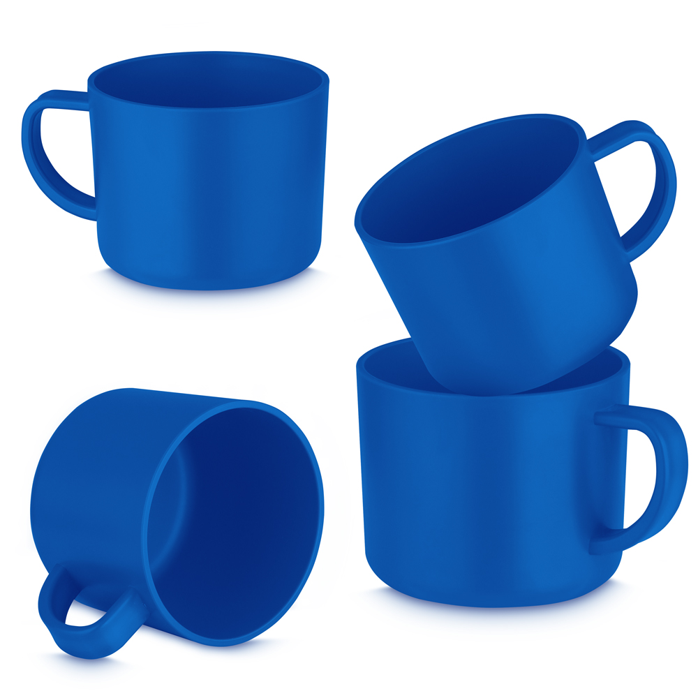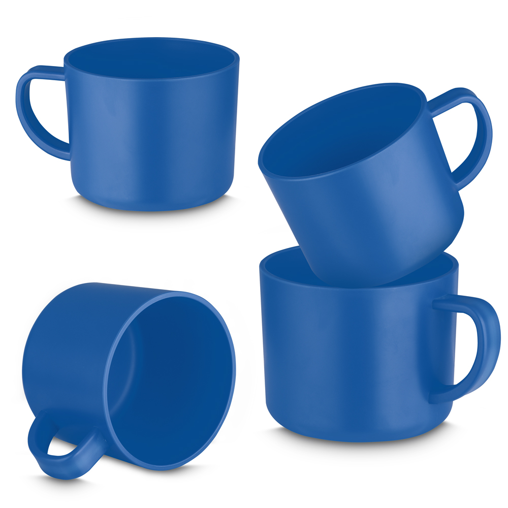 Conjunto com 4 xícaras de plástico RPET da mesma cor, permitindo ir ao microondas, com capacidade de até 200ml. * A temperatura interna do microondas não pode ser superior a 120 graus.