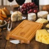 Conjunto composto por tábua retangular para Queijo em Bambu com sulco ao redor. Conta também com uma faca com ponta e garfo em Madeira/Inox.
