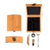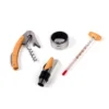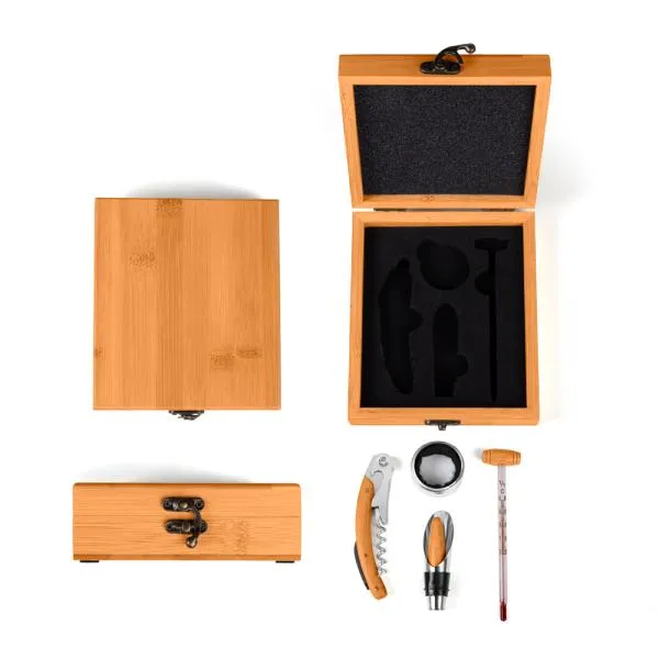 Composto por cinco acessórios para vinho em metal e inox, sendo um anel corta-gotas, um funil direcionador com tampa e tampão, ambos com detalhes emborrachados para melhor fixação na garrafa, um termômetro e um abridor saca-rolhas modelo sommelier de alavanca simples com três funções acomodados em um estojo em bambu.