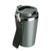 Copo de 350 ml com parede dupla, interior em inox 304 e exterior em plástico PP, tampa em plástico PP, alça de mão e acabamento com pintura fosca.