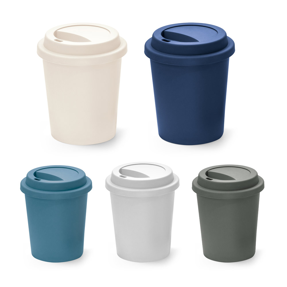 Copo de viagem com tampa e corpo em PP. Capacidade até 350 mL. Certificação EU Food Grade. Ø90 x 104 mm