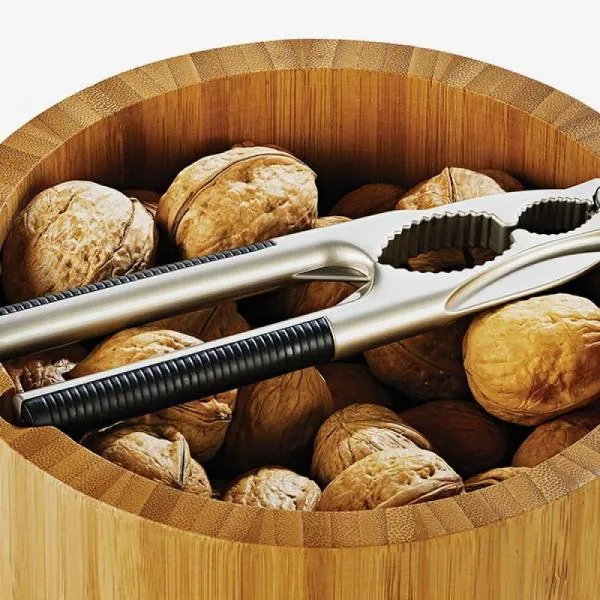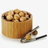 Confeccionada em bambu, com amplo espaço interno e capacidade para 1,5 litros. Acompanha um alicate quebra-nozes em metal cromado fosco envelhecido com detalhes em plástico preto nos cabos e abertura de até dois níveis de tamanho.