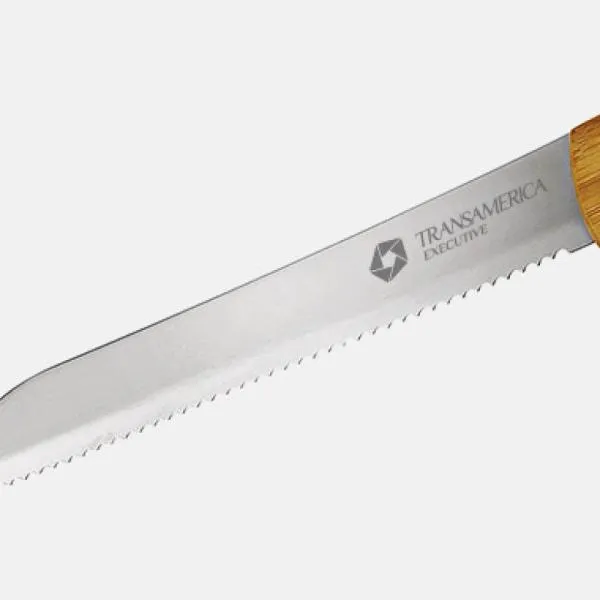 Faca de 7 polegadas para pão em Aço Inox cabo em Bambu, conta com design anatômico e patenteado, possui lâmina em Aço Inox e dois rebites em Aço Inox 304, um dos mais resistentes à ferrugem e corrosão.