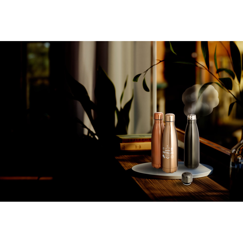 Garrafa em aço inox de parede dupla térmica, isolada a vácuo. Garrafa com acabamento metalizado e tampa em aço inox. Capacidade até 510 mL. Fornecido em caixa presente de papel kraft reciclado. Certificação EU Food Grade. ø70 x 255 mm