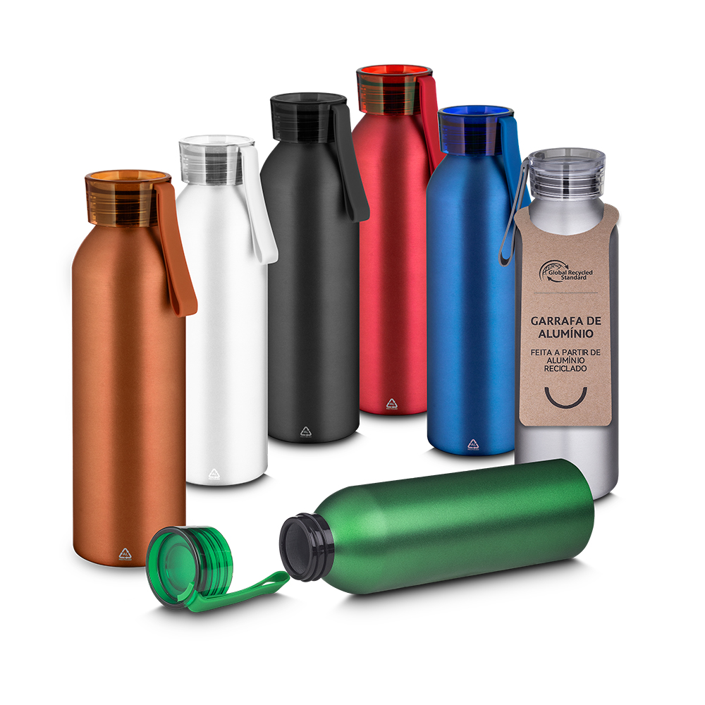 Garrafa em alumínio reciclado acabamento mate com capacidade 600ml. Tampa rosqueável em plástico e alça de transporte emborrachada. *Todas as garrafas acompanham etiqueta em papel kraft com descrição do produto.