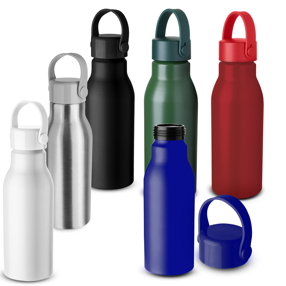 Garrafa em alumínio com capacidade de 650ml. Tampa rosqueável em plástico com alça em silicone na cor do produto. Pintura fosca.