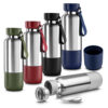 Garrafa térmica em aço inox com parede dupla isolada a vácuo e capacidade de 500ml. Alça de transporte em cordão. Tampa rosqueável, vedada por um anel de silicone e com uma argola tipo mosquetão para o cordão. Parte superior da tampa possui um compartimento para pequenos objetos que acompanha um cordão adicional de 68cm para substituição e cordão de mão com 10cm. Possui copo adicional rosqueável na parte inferior da garrafa de 250ml. Conserva líquidos : ☀️8 horas ❄️12 horas