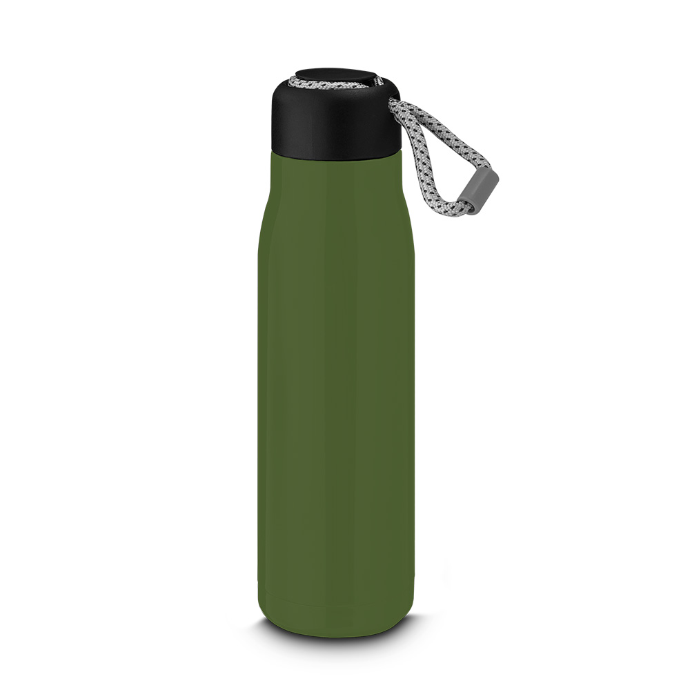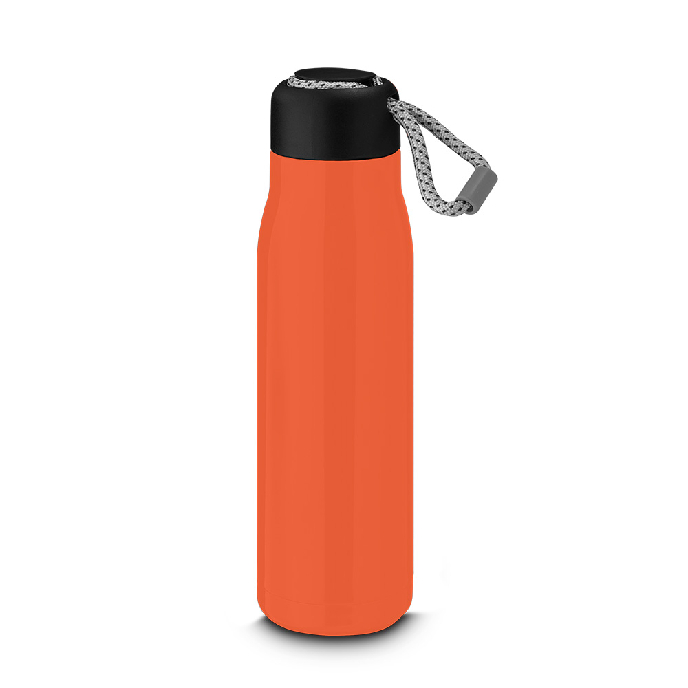Garrafa térmica em aço inox brilhoso com parede dupla isolada a vácuo, com capacidade de até 550ml. Alça de transporte em corda. Tampa plástica rosqueável com anel de silicone para vedação. Conserva líquidos : ☀️8 horas ❄️12 horas