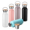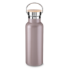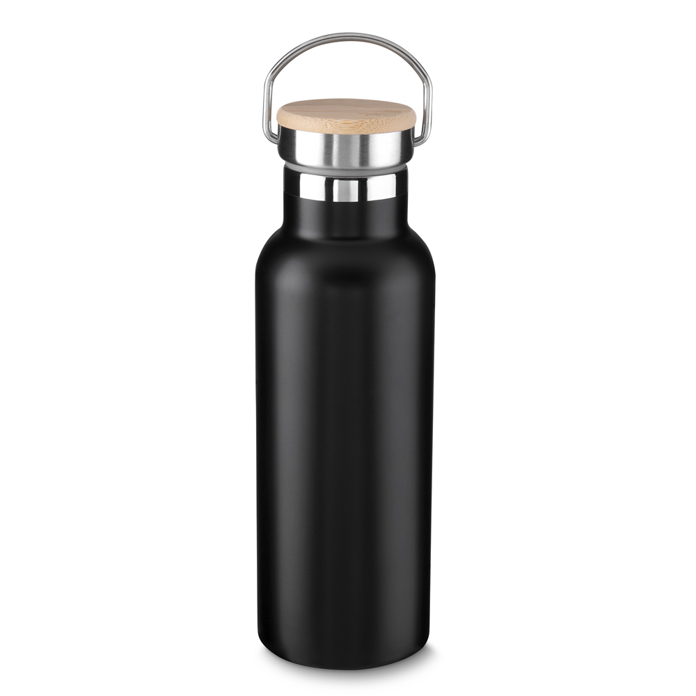 Garrafa térmica em aço inox com parede dupla isolada a vácuo e com capacidade de até 500ml. Tampa rosqueável com revestimento em fibra de bambu. Alça em metal. Detalhe cromado. Conta com uma pintura fosca. Conserva líquidos : ☀️8 horas ❄️12 horas