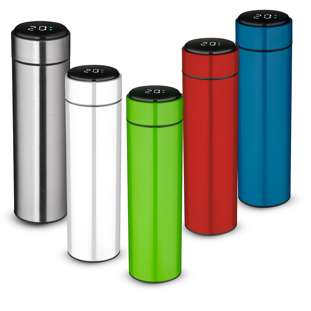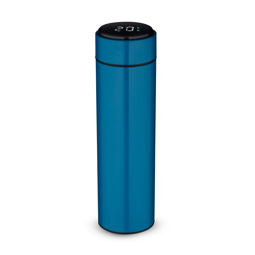 Garrafa térmica em aço inox com parede dupla isolada a vácuo, com capacidade até 450ml. Tampa rosqueável com anel de silicone para vedação. Possui infusor para chás. Display LED com termômetro digital na tampa para indicar a temperatura do líquido. Possui tampa removível para a troca da bateria CR2032. *Acompanha bateria extra modelo CR2032 em caso necessidade de substituição. Conserva líquidos : ☀️8 horas ❄️12 horas