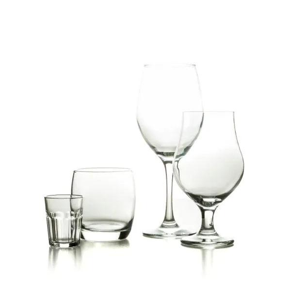 Jogo de copos de vidro. Conta com 1 copo de cada para vinho/cerveja/whisky/cachaça de vidro.