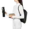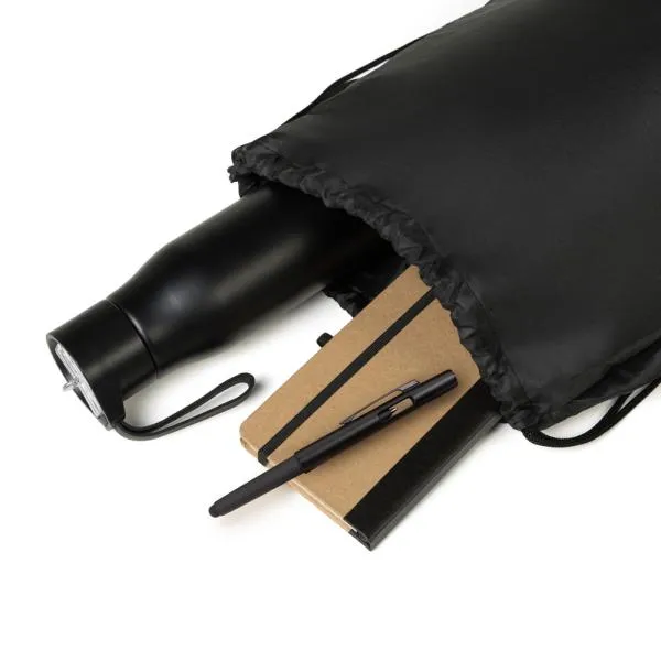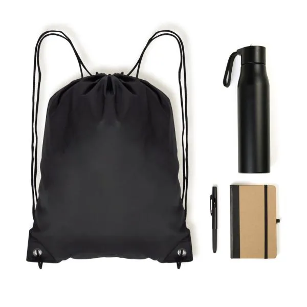 Composto por garrafa em alumínio reciclado na cor preta; mochila sacola preta em Nylon 190D com alças ajustáveis; caderno para anotações com capa dura nas cores Preto/Bege e caneta esferográfica em ABS preta.